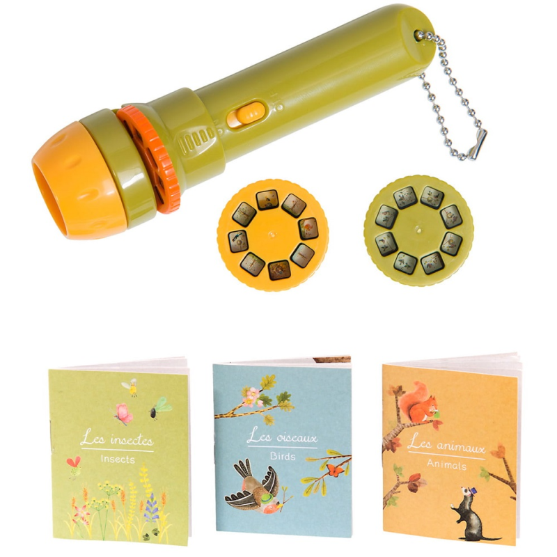 - projektor, 3 mini książeczki ilustrowane ptakami, owadami i zwierzętami,