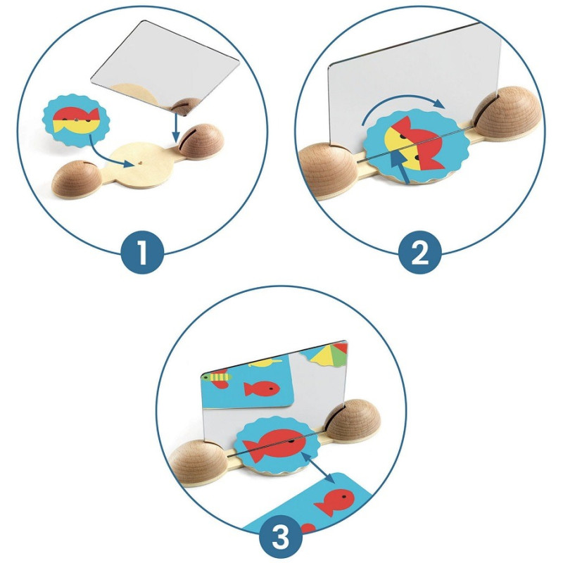 - 1 drewnianą podstawę, 1 plastikowe lusterko, 20 okrągłych kart i 4 duże karty z wzorami