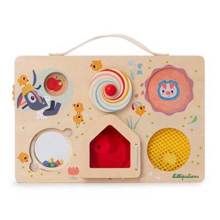 koło iluzji optycznych, okienko piszczące przy naciskaniu, okienko z lusterkiem i grzechotką w jednym,