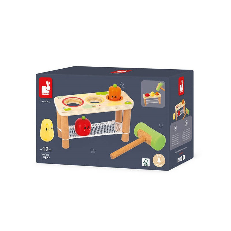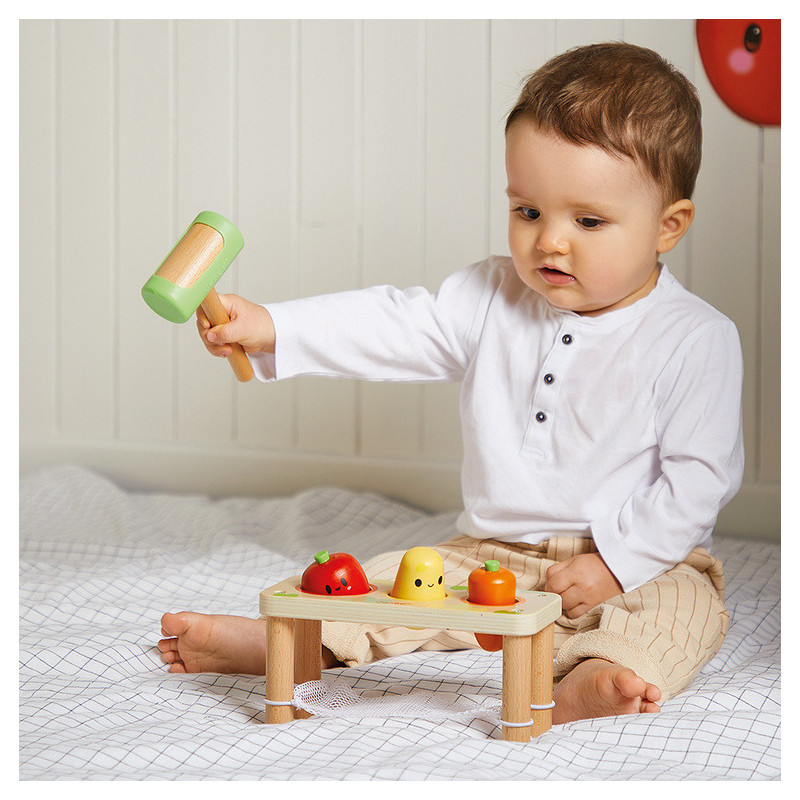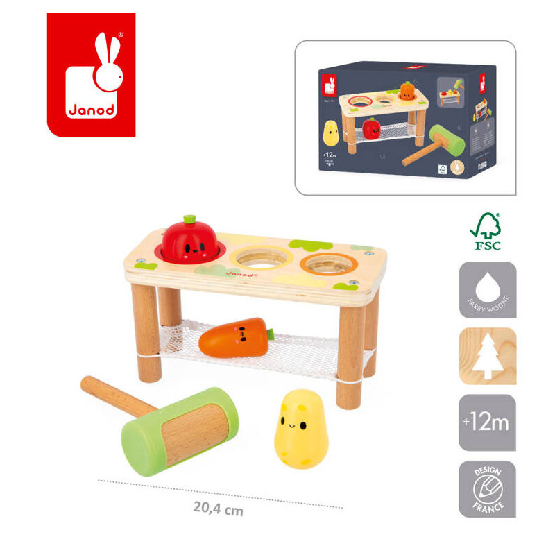 Drewniana przebijanka z warzywami z kolekcji Farma to mini-stoliczek z otworami,