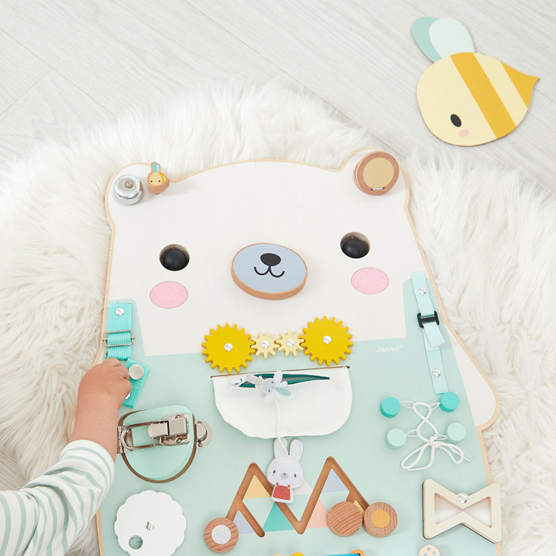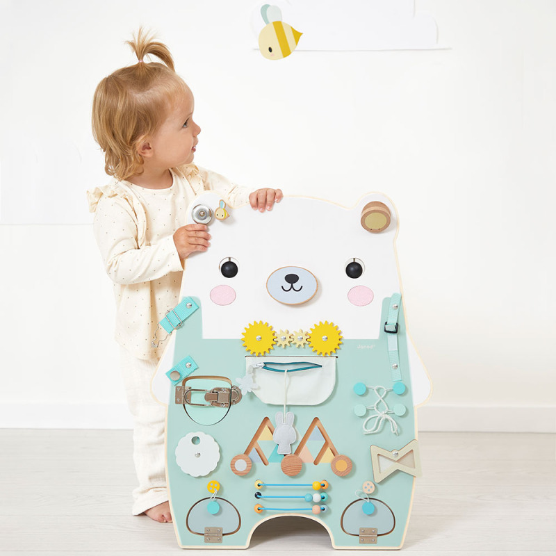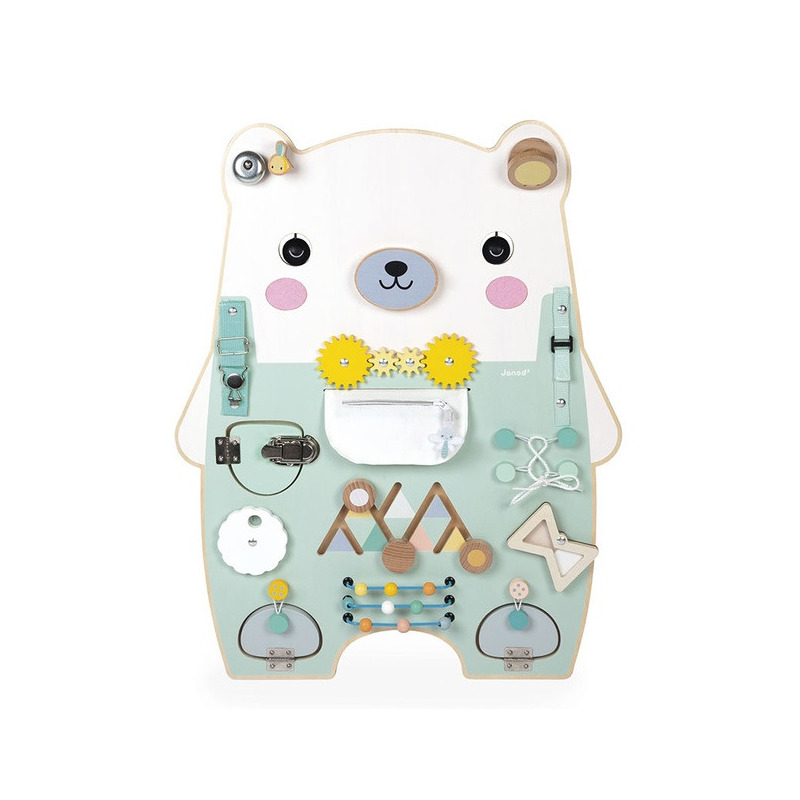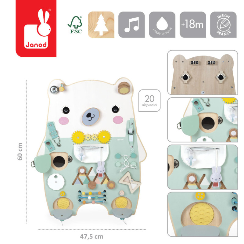 Duża drewniana tablica manipulacyjna z misiem zachęca do zabawy! Zachwyca estetyką wykonania i pięknymi detalami. Oferuje w sumie 20 aktywności, w tym m.in. różnego rodzaju zapięcia, wiązania i elementy do przesuwania, czy stymulacji sensorycznej (zróżnicowane fakturowo), kółka zębate, czy dzwonek.