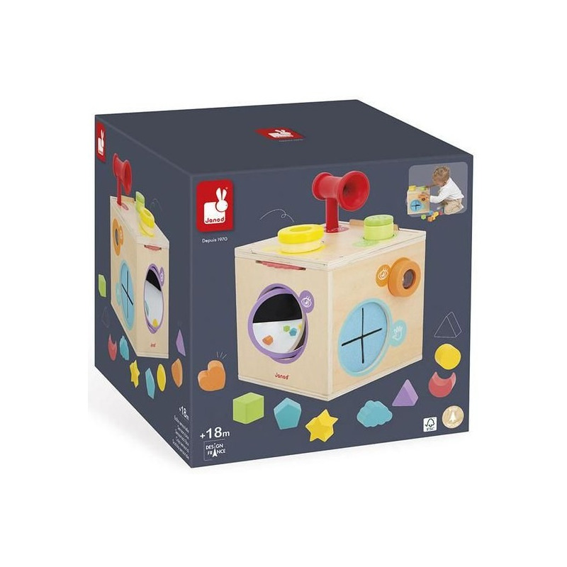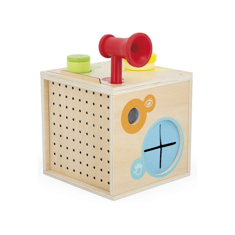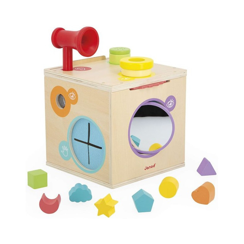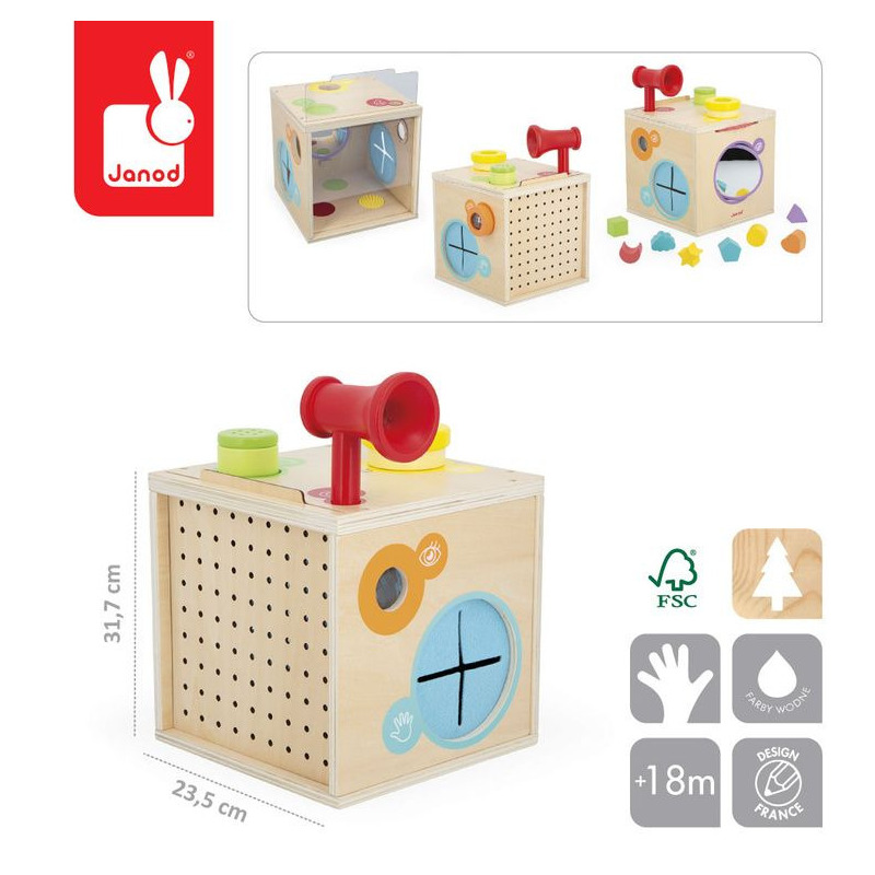 Drewniana wielofunkcyjna kostka sensoryczna marki JANOD to piękna i pomysłowa zabawka dla dzieci. Oferuje wiele różnorodnych aktywności pobudzających zmysły, takich jak: bezpieczne obrotowe lusterko, luneta, szkło powiększające (wzrok), powierzchnie o różnych fakturach do rozpoznawania bez patrzenia (dotyk), grzechotka, tuba (słuch), koło zębate oraz 8 poręcznych geometrycznych klocków. Dzięki zdejmowanym panelom (drewnianemu i przezroczystemu), można regulować dopływ światła do środka, co urozmaica zabawę i wpływa na trudność rozpoznawania kształtów. Dodatkowo każdemu zmysłowi przypisano osobny kolor i symbol, co ułatwia dziecku orientację i wspiera naukę.