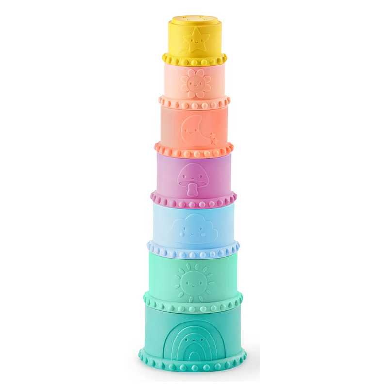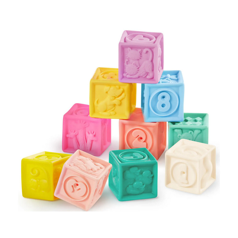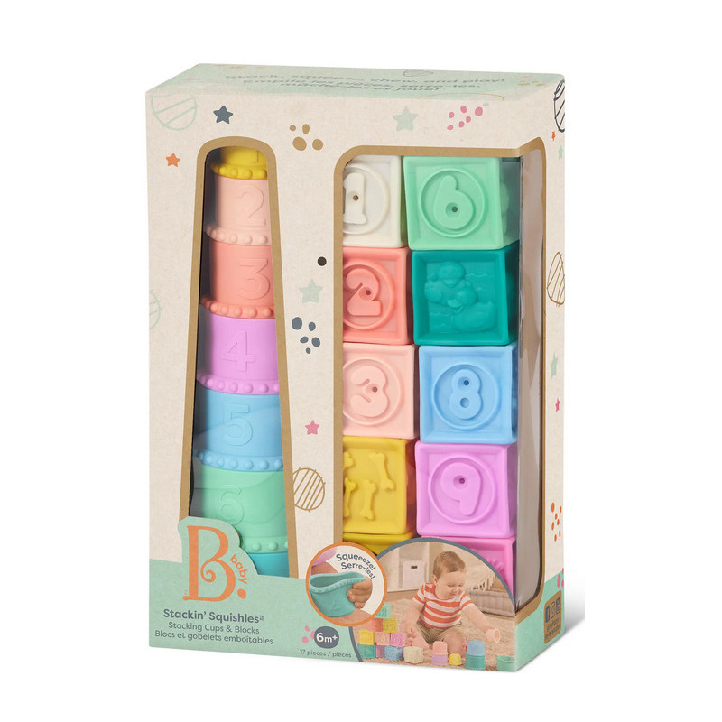 MIĘKKIE KLOCKI I KUBECZKI SENSORYCZNE 2w1 pastelowe do nauki liczenia Stackin’ Squishies 17 el. B.Toys 6m+