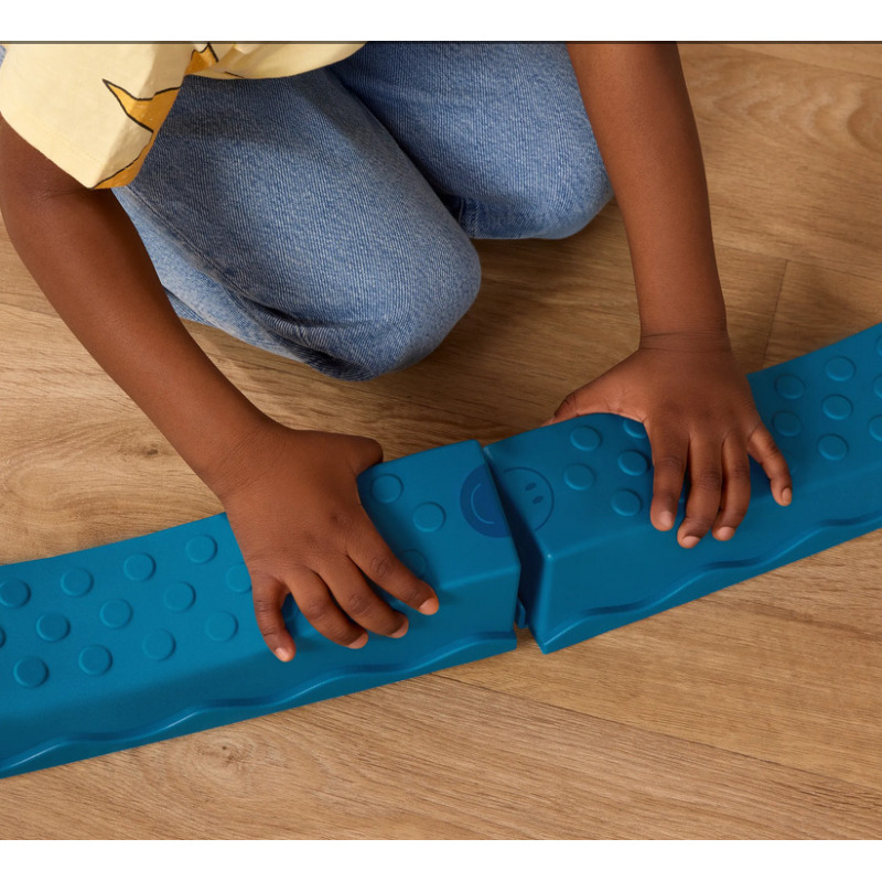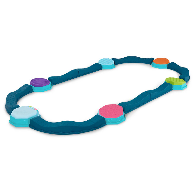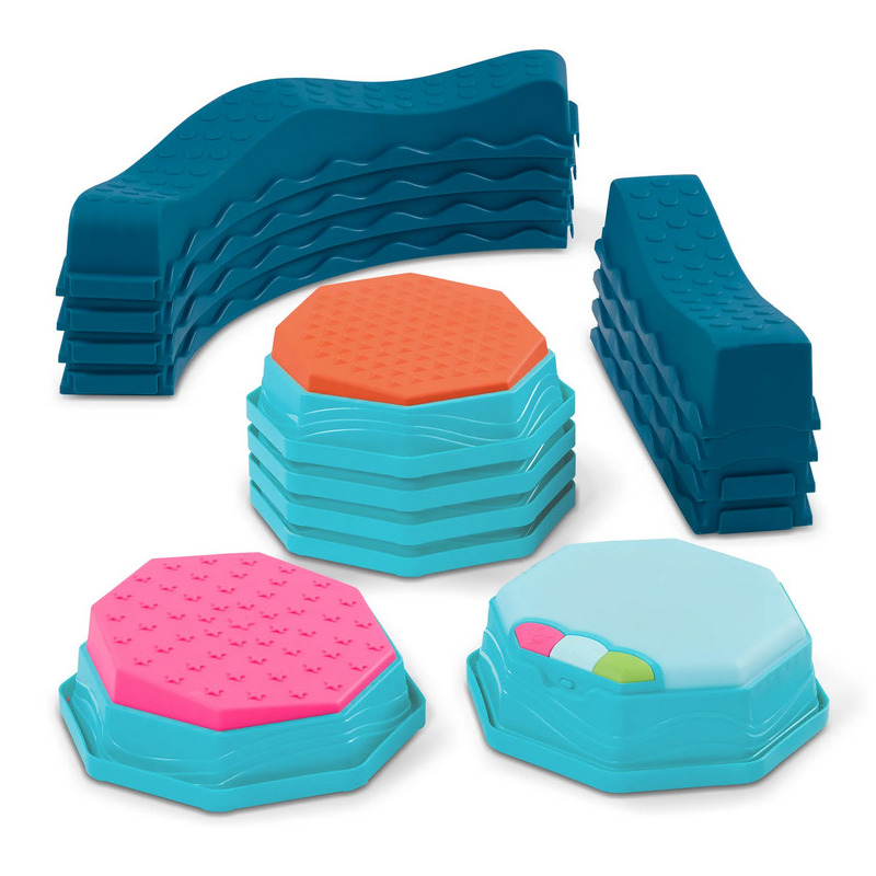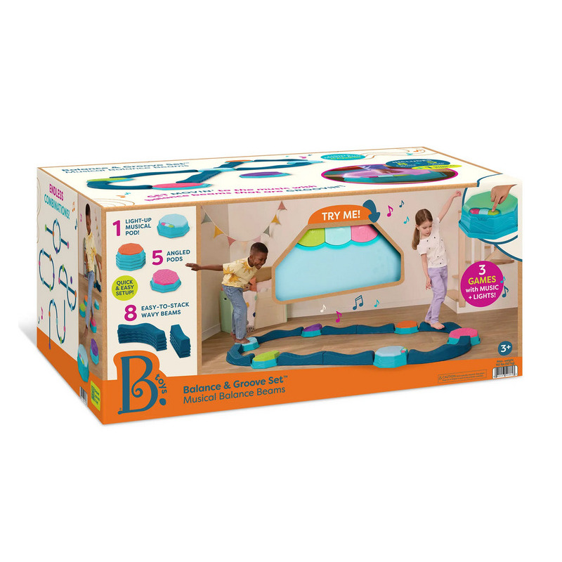 Pierwszy krok, delikatna fala, potem łuk – i nagle zwykły pokój zamienia się w tor pełen przygód! Balance & Groove Set od B. toys to muzyczna ścieżka sensoryczna, która zachęca dzieci do aktywnej zabawy i odkrywania ruchu. Ścieżka składa się z pofalowanych belek (część z nich wygięta w łuk) oraz pochyłych pól sensorycznych o różnych fakturach. Każdy kamień ma inną powierzchnię, a każdy krok jest nowym wyzwaniem– idealnym do ćwiczenia równowagi i koordynacji. W zestawie znajduje się też moduł muzyczny z efektami świetlnymi LED. To on nadaje rytm zabawie, prowadząc dzieci przez trzy gry: Freeze Dance, Hop-to-It i Dance Party.