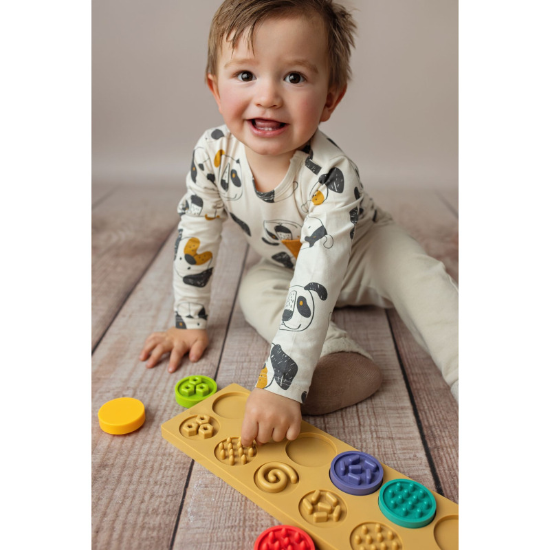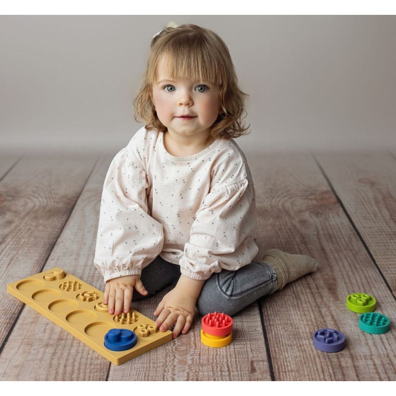 Puzzle sensoryczne KÓŁECZKA od Mom's Care to innowacyjna zabawka edukacyjna stworzona z myślą o wszechstronnym rozwoju Twojego dziecka. Zestaw składa się z miękkiej, bezpiecznej deski z sześcioma różnorodnymi kształtami i odpowiadającymi im otworami oraz sześciu kółeczek sensorycznych, z których każde posiada unikalną fakturę odpowiadającą jednemu z kształtów na desce. Zabawa polega na dopasowywaniu kółeczek do odpowiednich miejsc na desce, co pozwala dziecku na poznawanie różnych struktur poprzez dotyk.