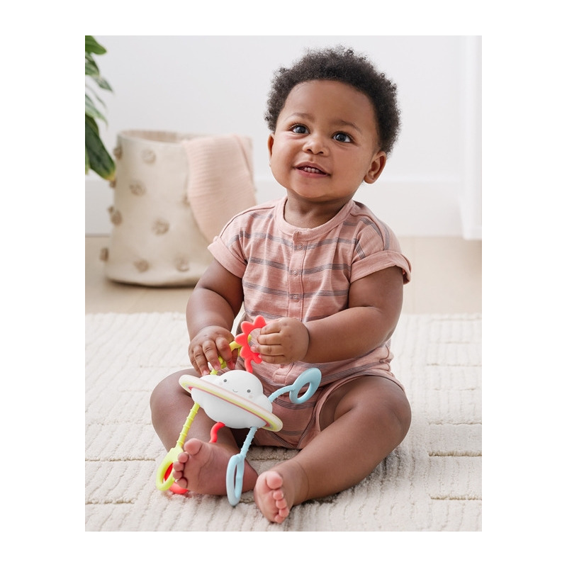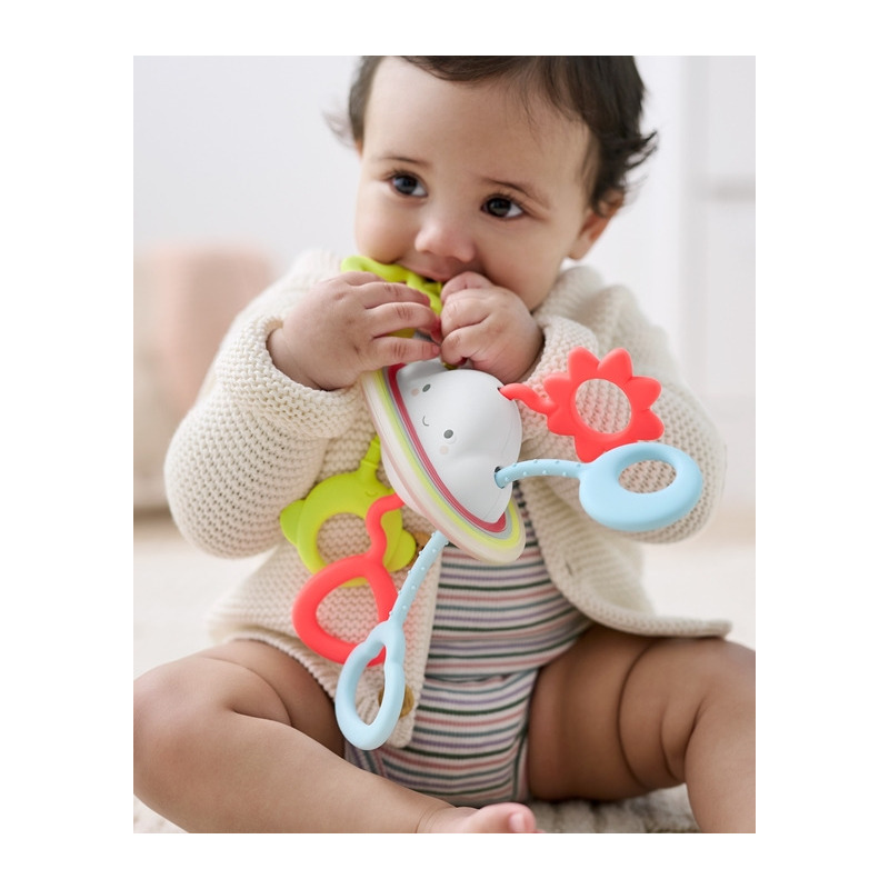 To zabawka idealna do odkrywania i zabaw sensorycznych. Przeciaganiec posiada wiele struktur, kształtów i kolorów, a same odnóża wykonane są z miękkiego silikonu przyjaznego dla małych dziąseł i ząbków.
