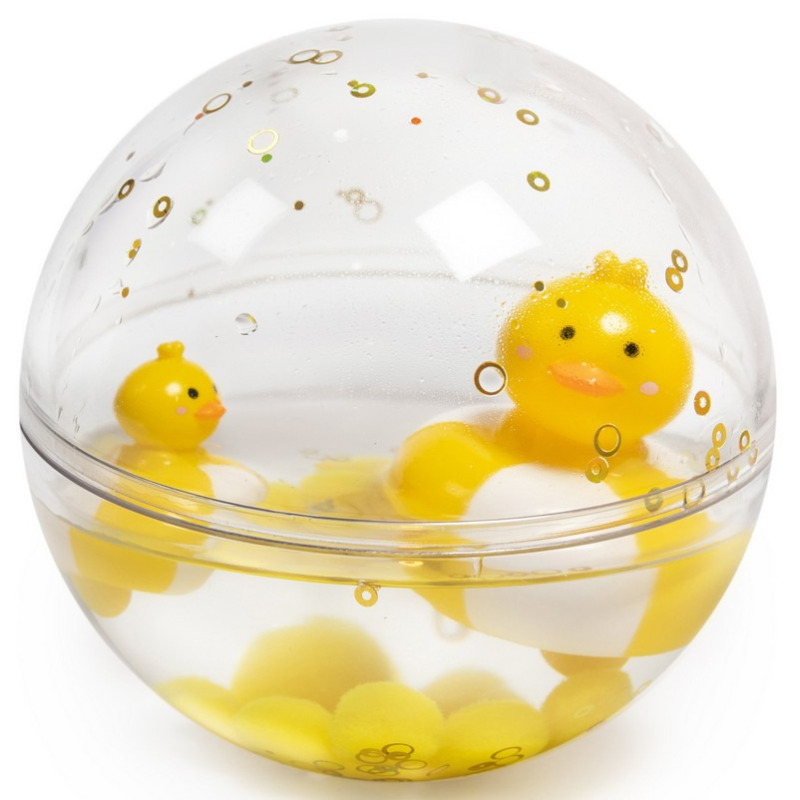 Petit Boum Happy Bubbles – kula sensoryczna o zwiększonej trwałości, wspierająca rozwój motoryczny i zmysłowy dziecka, wykonana z bezpiecznych materiałów i idealna do turlania oraz nauki przyczynowo-skutkowej. Sympatyczna kaczuszka i jej maleństwo zawsze pływają razem, dając maluchowi poczucie ciepła i bliskości. Wesoło unoszą się wśród mieniących się drobinek, a ich spokojny ruch uspokaja i rozwesela jednocześnie. Z tą parą każda kąpiel zamienia się w przygodę na jeziorze pełnym kaczek.
