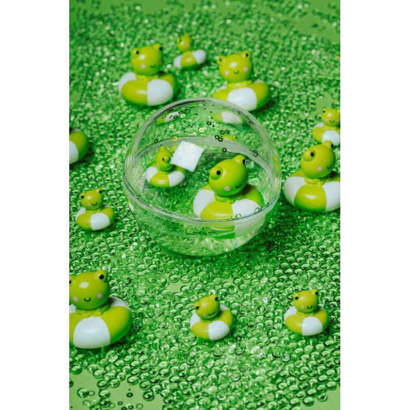 Zwierzątka unoszą się w przejrzystej kuli wypełnionej płynem i kolorowymi drobinkami, które pięknie wirują przy każdym ruchu.