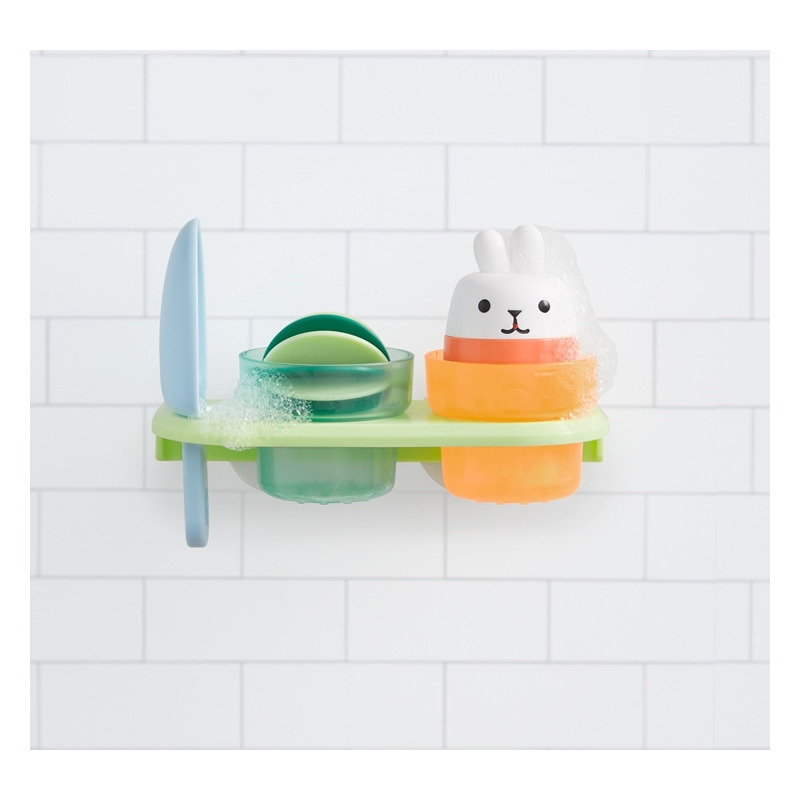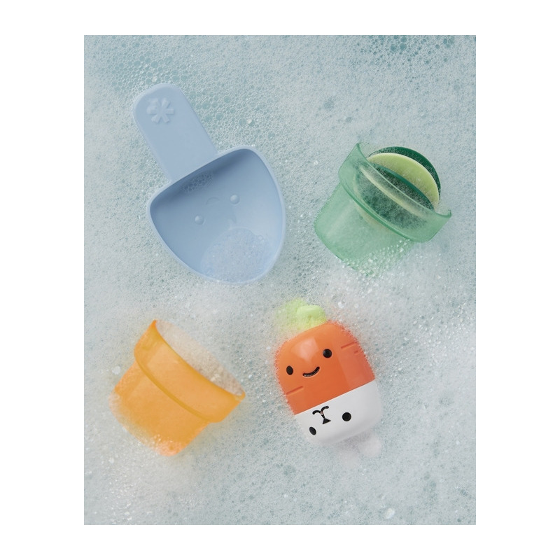 Uroczy zestaw z motywem ogródka, a w nim mnóstwo elementów do zabawy w wannie i poza nią! Znajdziesz tu podstawkę z otworami na dwie doniczki. Każda z nich ma inne dziurki na dnie, dzięki czemu tworzy inny efekt wodny podczas przelewania. Półprzeźroczysta zielona doniczka ma wbudowany wiatraczek, który kręci się za każdym razem kiedy wlewamy tam płyn. Nie zabrakło tu pojemnej łopatki, dzięki której dziecko może ćwiczyć precyzję wlewania wody do doniczek. Najbardziej uroczym elementem zestawu jest króliczek i marchewka, które można połączyć i używać jako zabawki do pryskania wodą.