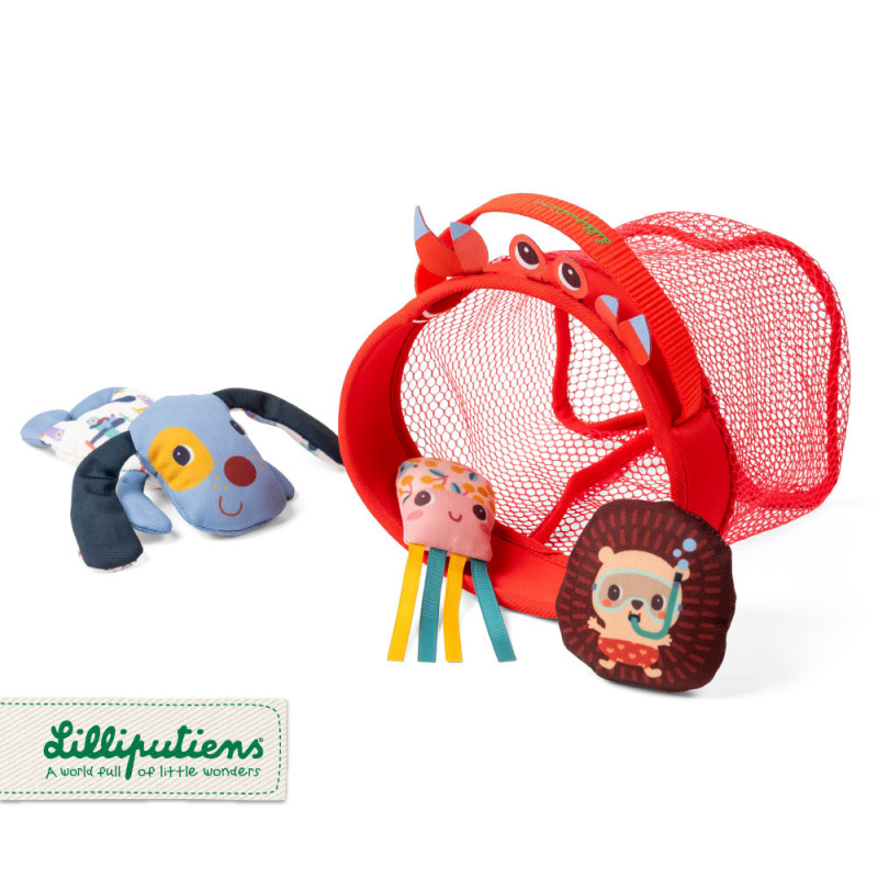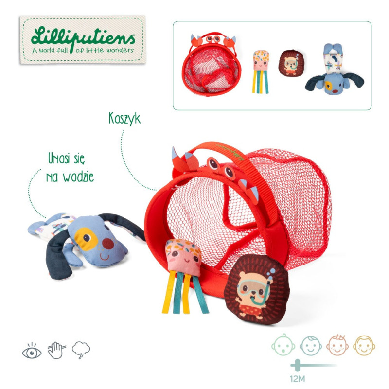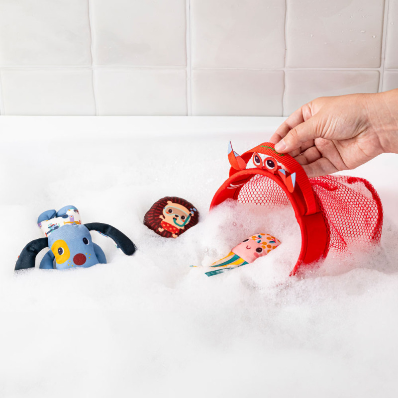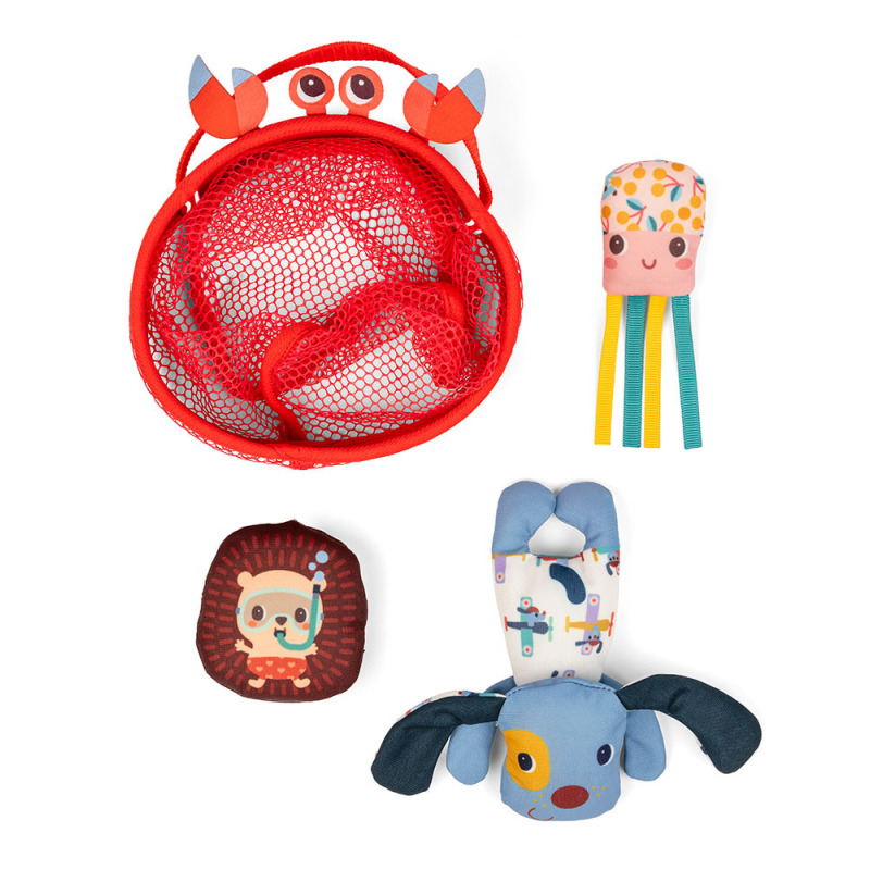 Zestaw zabawek z siecią rybacką z kolekcji Piesek Jules to idealna zabawka do kąpieli. Wykonane są z miękkiego, łatwego do czyszczenia i szybkoschnącego materiału. Czerwona przestronna sieć ma krabie oczy i szczypce oraz wygodny uchwyt. Można do niej łapać i przechowywać w niej dołączone do zestawu stworzenia: meduzę z tasiemkami sensorycznymi, nurkującego Jeża Leona oraz pływającego Pieska Julesa. Wszystkie one unoszą się na wodzie.