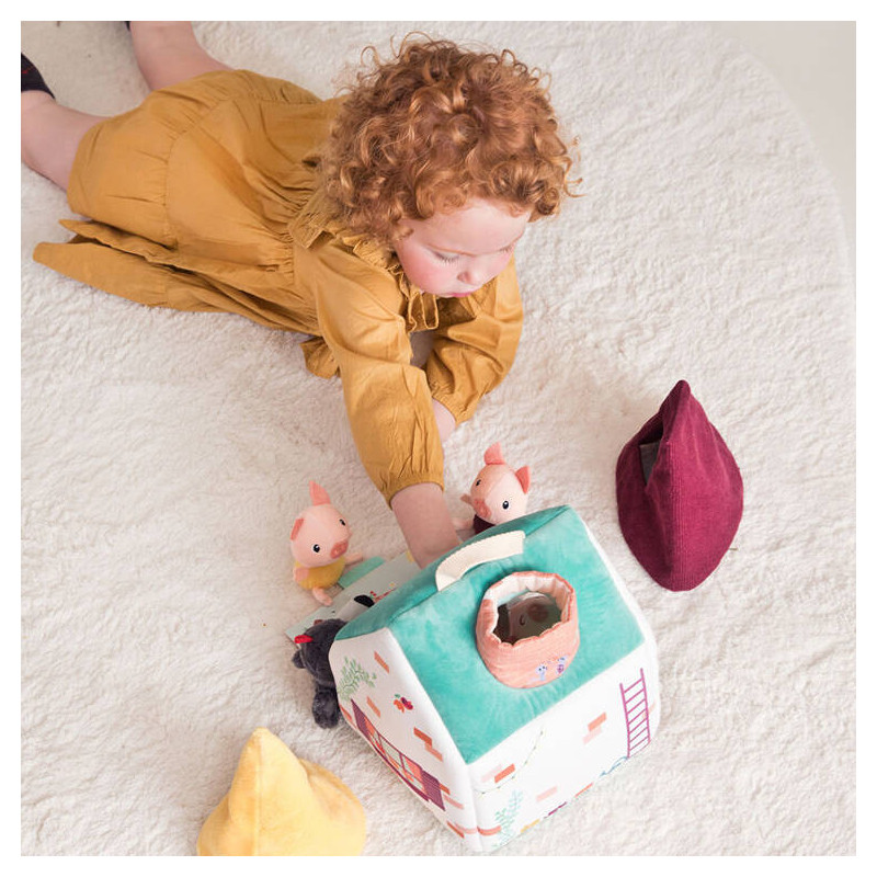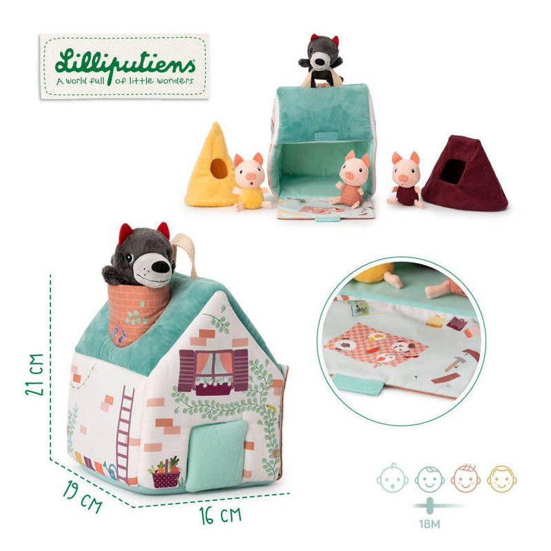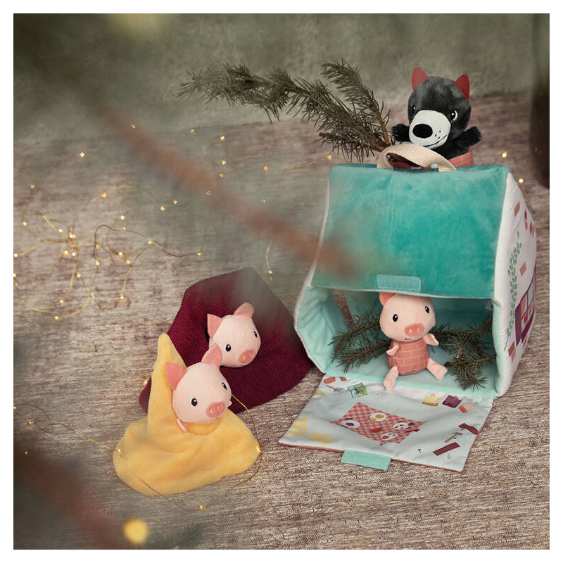 Znajdują się w nim trzy świnki w ubrankach, których kolory odpowiadają barwom domków oraz wilk.