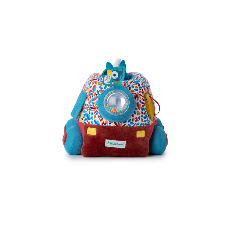 Całość jest solidnie wykonana i w pełni bezpieczna. Zaskakuje i pobudza dziecięcą wyobraźnię. Rozwija małą motorykę (chwytanie, potrząsanie, przesuwanie, pociąganie, wkładanie, wyciąganie), aktywizuje zmysł słuchu (grzechocze, piszczy), wzroku (lusterko) i dotyku (różne wypustki i tkaniny).