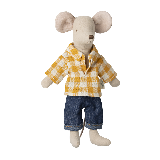 Myszka ubrana jest w koszulę w kratę i jeansowe spodnie.