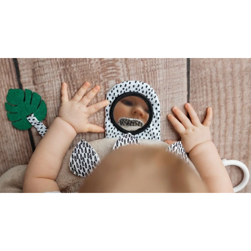 Leniwiec posiada bezpieczne lusterko, w którym maluch może się przeglądać. To nie tylko fascynująca zabawa, ale także doskonałe ćwiczenie świadomości własnego ciała i rozpoznawania twarzy.