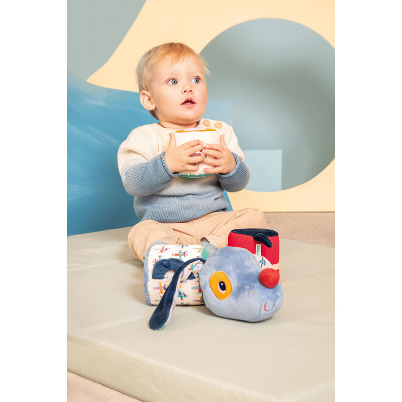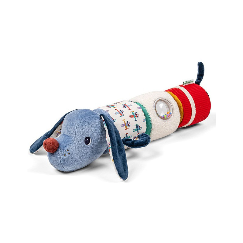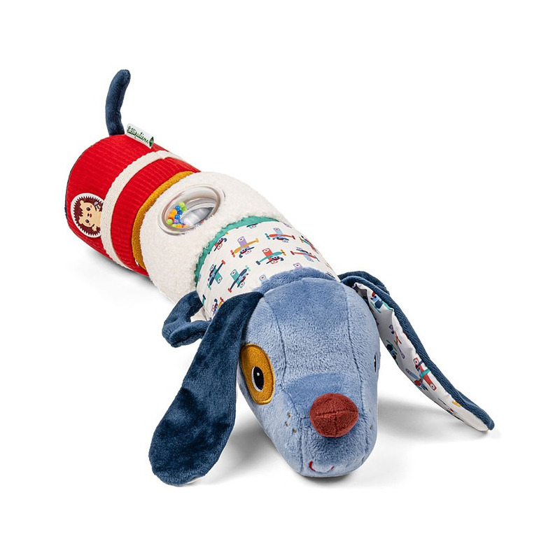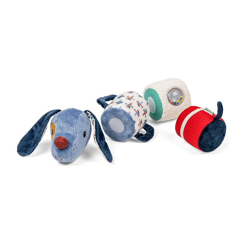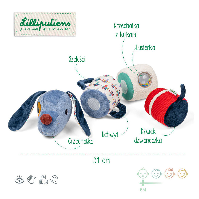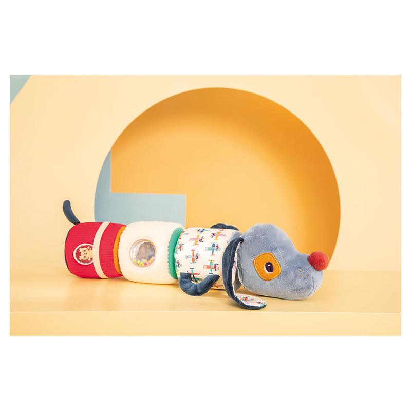 Wałek dźwiękowy z kolekcji Piesek Jules to niebanalne, miękkie i wielofunkcyjne źródło rozrywki i nauki. Składa się z 4 poręcznych elementów, z których każdy uszyty jest z materiałów o różnych wzorach i fakturach oraz posiada ukryte funkcje. W głowie pieska znajduje się grzechotka, inna część szeleści, kolejna posiada okienko z kolorowymi, grzechoczącymi kuleczkami i miękkim lusterkiem, a ostatnia ma ukryty wewnątrz dzwoneczek. Piesek posiada dodatkowo stymulujące sensorycznie długie uszy, puchaty nosek i sterczący ogonek. Elementy można łączyć ze sobą dzięki rzepom.