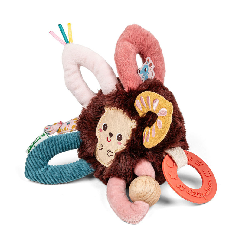 Piłeczka aktywizująca wielofunkcyjna Jeżyk Leon to idealna pierwsza zabawka dla niemowląt. Ma postać długowłosego jeżyka, którego „kolce” tworzą liczne miękkie uchwyty z różnych tkanin i z różnymi detalami, m.in. supełkiem, drewnianym koralikiem do przesuwania, wypukłym haftem czy szeleszczącym wypełnieniem. W piłce-główce znajduje się ponadto grzechotka, a na zawieszce – silikonowy fakturowany gryzak.
