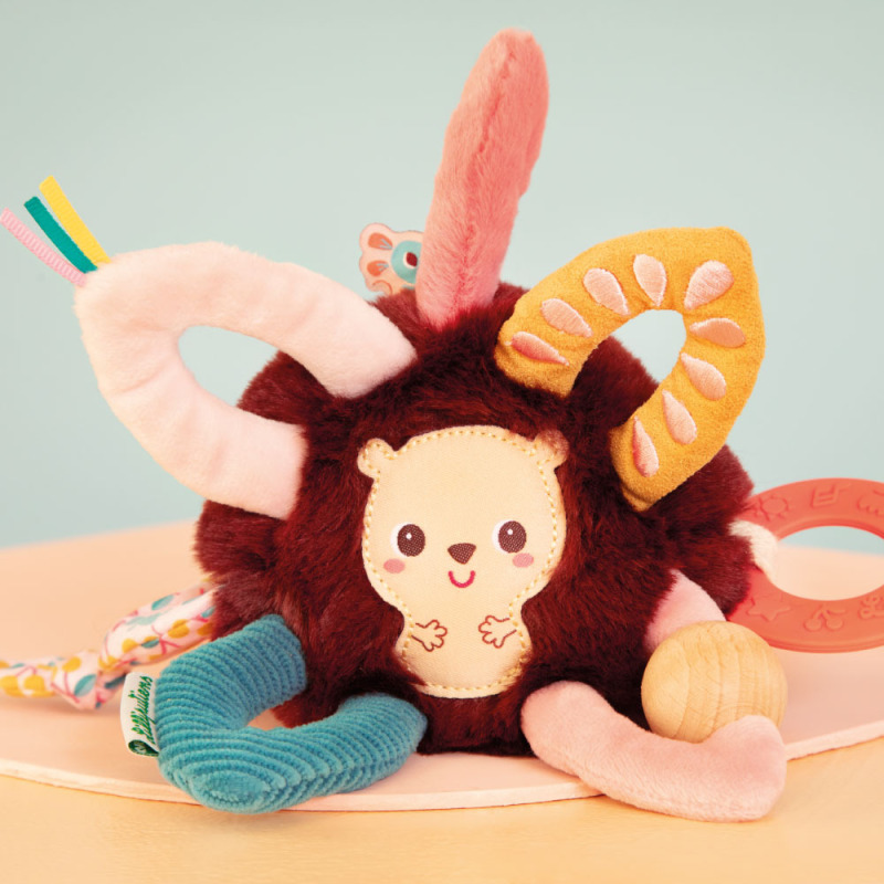 aktywizuje zmysł słuchu (grzechocze, szeleści) i dotyku (zróżnicowane tkaniny i liczne wypustki).