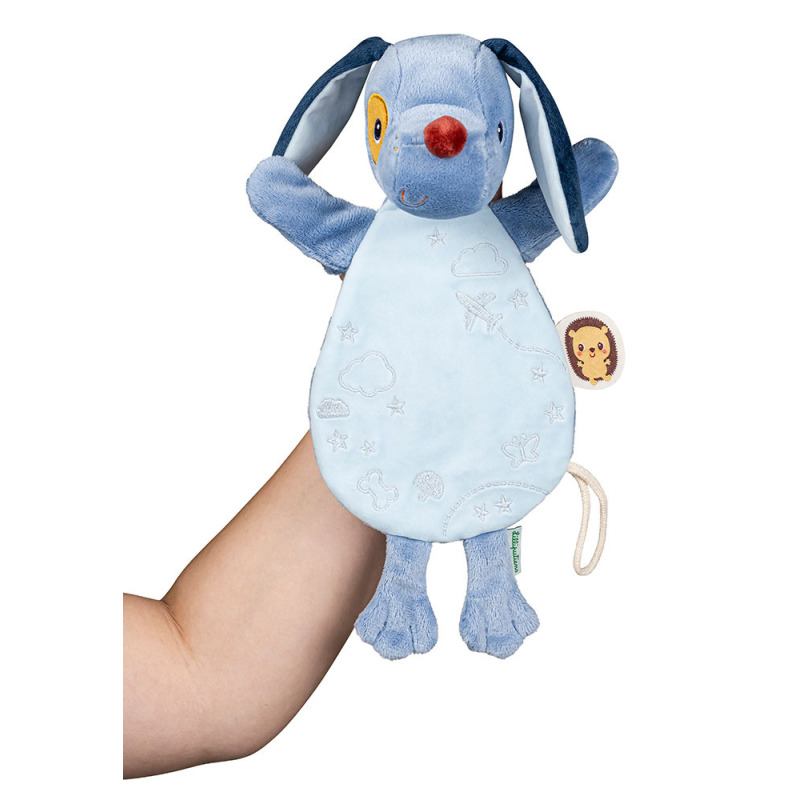Przytulanka do spania Piesek Jules to wspaniały pierwszy przyjaciel maluszka. Jest idealna do tulenia, uspokajania i usypiania. Ma postać niebieskiego pieska z długimi uszami, sznurkową zawieszką do której można przymocować smoczek oraz z fluorescencyjnymi uszkami i brzuszkiem (świecą w ciemności). Przytulanka jest płaska, więc może pełnić funkcję komfortera, a dzięki otworowi w brzuszku – także pacynki, którą można poruszać i „ożywiać”.