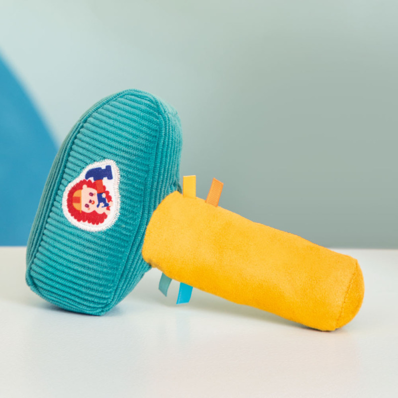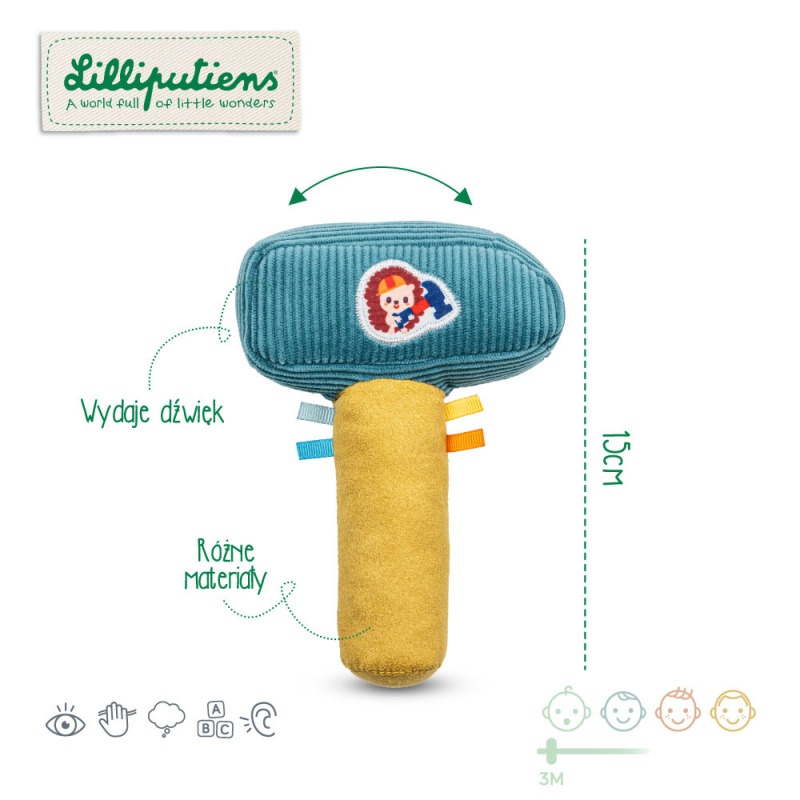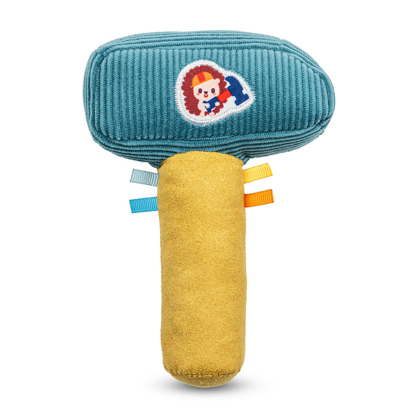 Grzechotka-młotek z kolekcji Jeżyk Leon to aktywizująca zabawka dla niemowląt. Ma postać pluszowego młotka z naszywką jeżyka w kasku. Potrząsana wydaje przyjemny dla ucha dźwięk. Jest poręczna i wykonana z różnorodnych materiałów, co dodatkowo stymuluje sensorycznie.
