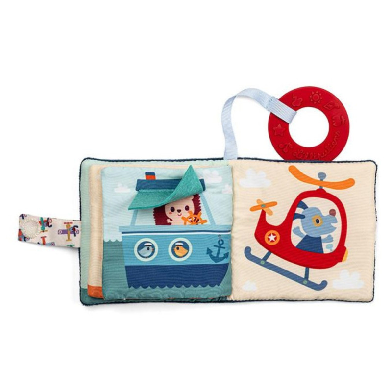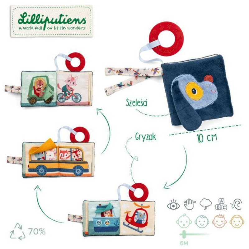 Mini-książeczka wielofunkcyjna z kolekcji Piesek Jules belgijskiej marki Lilliputiens to idealna pierwsza lektura dla maluszka. Książeczka ma przyjemną w dotyku pluszową okładkę z buźką i długimi uszami pieska. Każda ze stron książeczki przedstawia przygody Julesa i jego przyjaciół, przemieszczających się różnymi środkami transportu. Niektóre elementy uszyte są z fakturowanych tkanin, inne szeleszczą, jeszcze inne można odchylać. Kolorowe obrazki doskonale się nadają do snucia opowieści i łatwo zapadają w pamięć.