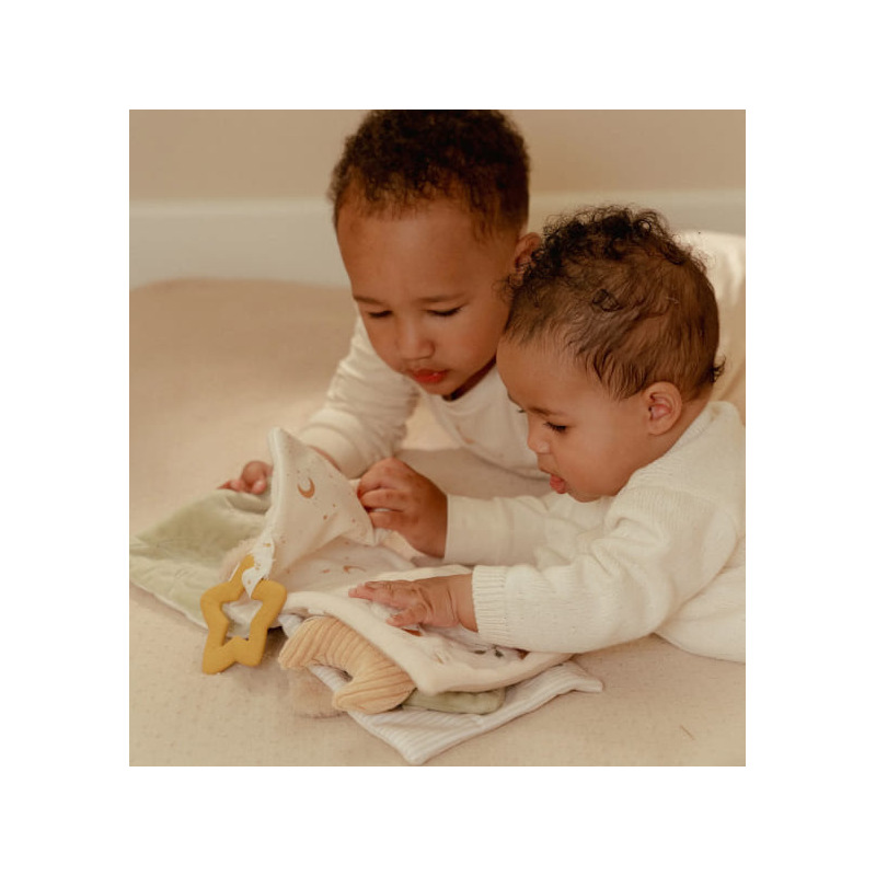 Duża książeczka aktywizująca z kolekcji Newborn Naturals od Little Dutch zawiera w środku różnorodne faktury materiału, dzięki którym maluszek może rozwijać swoje zmysły. Książeczka posiada uwielbiane przez maluchy lustereczko, metki, szeleściki oraz grzechotkę. W środku znajdziesz różnorodne faktury, metki, szeleściki, grzechotkę oraz bezpieczne lustereczko – wszystko, co niemowlęta uwielbiają!