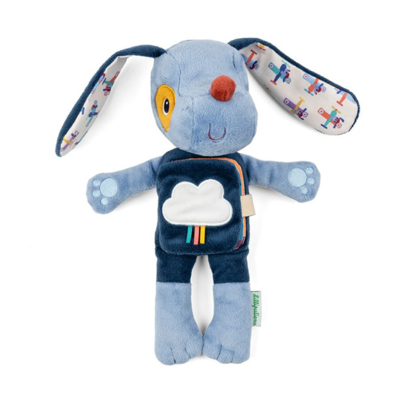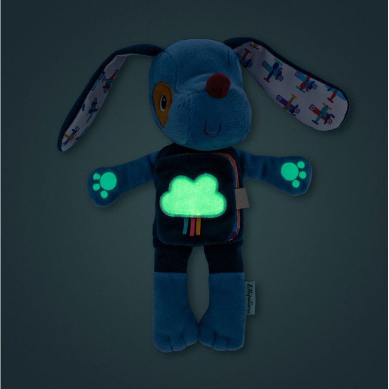 Książeczka-przytulanka aktywizująca Piesek Jules belgijskiej marki Lilliputiens to idealna pierwsza lektura i jednocześnie uroczy przyjaciel maluszka. Brzuszek pieska to miękka książeczka, na stronach której pojawiają się zwierzątka z ekipy Lilliputiens m.in. Kaczorek Gaspard czy Kotka Jeanne, prezentujące swoją wieczorną rutynę przed snem – zakładanie piżamki, mycie ząbków czy buziak na dobranoc. Dodatkową atrakcją jest chmurka na pierwszej stronie oraz wnętrze łapek pieska, które świecą w ciemności. Dzięki fluorescencyjnym elementom Jules staje się doskonałym towarzyszem do zasypiania i doskonałą alternatywą dla lampki nocnej – delikatnie rozprasza mrok, daje dziecku poczucie bezpieczeństwa i ułatwia odnalezienie przytulanki w nocy.