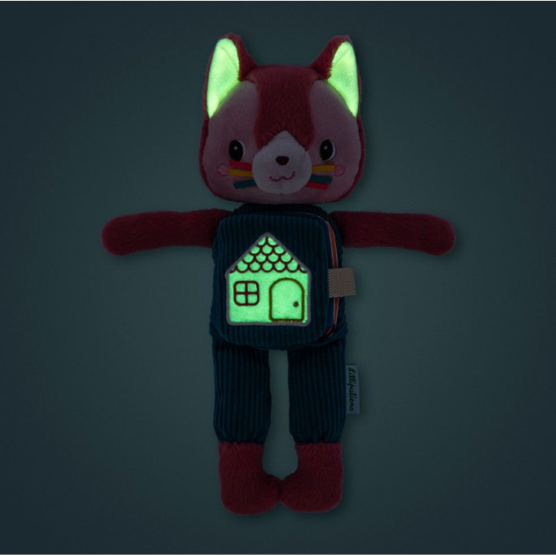 Książeczka-przytulanka aktywizująca Kotka Jeanne belgijskiej marki Lilliputiens to idealna pierwsza lektura i jednocześnie uroczy przyjaciel maluszka. Brzuszek kotki to miękka książeczka, na stronach której pojawiają się zwierzątka z ekipy Lilliputiens, m.in. Kaczorek Gaspard czy Piesek Jules, prezentujące swoją wieczorną rutynę przed snem – zakładanie piżamki, mycie ząbków czy buziak na dobranoc. Dodatkową atrakcją jest domek na pierwszej stronie oraz wnętrze kocich uszek, które świecą w ciemności. Dzięki fluorescencyjnym elementom Jeanne staje się doskonałą towarzyszką do zasypiania i świetną alternatywą dla lampki nocnej – delikatnie rozprasza mrok, daje dziecku poczucie bezpieczeństwa i ułatwia odnalezienie przytulanki w nocy.