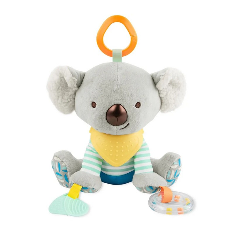 Zawieszka w kształcie uroczego misia koala posiada wiele różnych aktywizujących elementów, które na pewno zainteresują maluszka. Szeleszczące dźwięki, wystające elementy, grzechotkę, przyciągające uwagę wzory i kolory oraz chusteczkę zwaną bandana, którą możemy gryźć by ukoić ból dziąseł podczas ząbkowania. Dodatkowym elementem do gryzienia jest listek. Zabawka posiada uchwyt, dzięki któremu łatwo przyczepisz ją do maty edukacyjnej, fotelika, czy wózka.