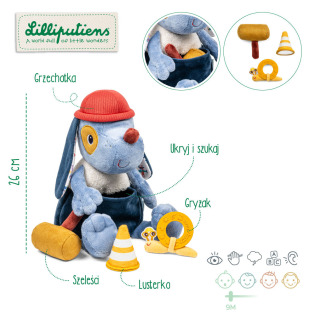 Zabawka motywuje do zabawy, potrząsania, prób rzucania i turlania,