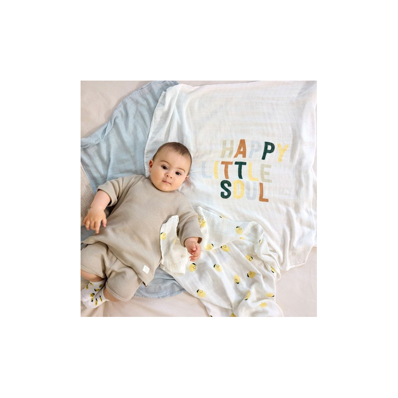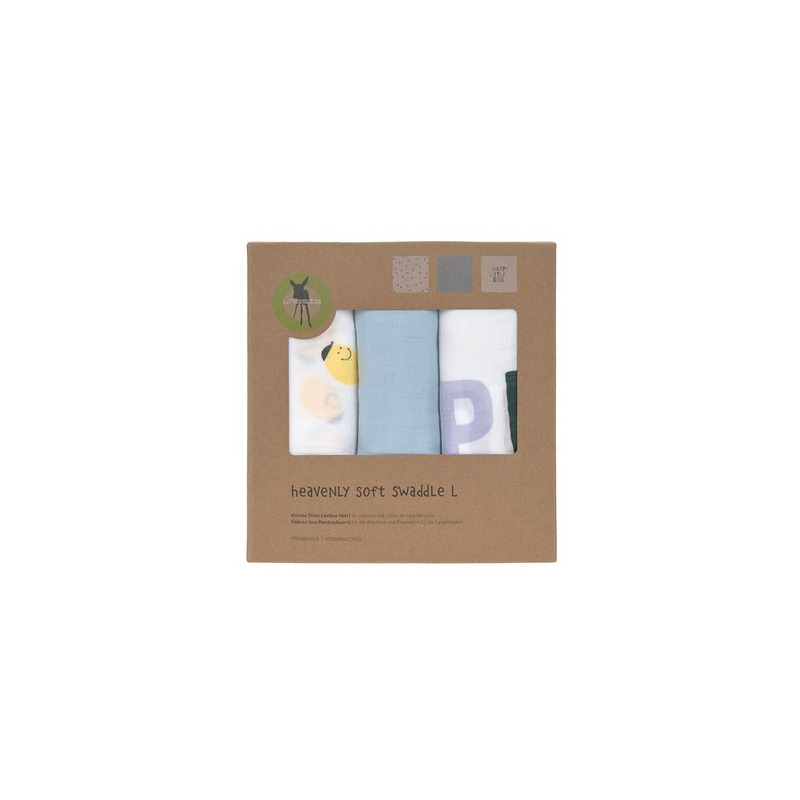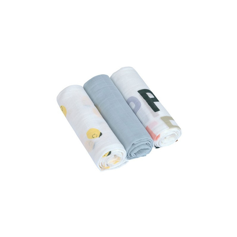Komplet trzech wielofunkcyjnych bambusowych otulaczy niemieckiej marki LASSIG. Jeden biały z motywem uśmiechniętej cytrynki (multiprint), drugi biały z kolorowym napisem HAPPY LITTLE SOUL, trzeci błękitny. Kocyki mają spore rozmiary – 80x80 cm – i mogą być używane np. do owijania maluszka, jako pieluszka do odbijania po karmieniu, okrycie podczas letniej drzemki, osłona do wózka, jako prześcieradełko, chusta do karmienia i na wszelkie inne sposoby według potrzeb. Są jednowarstwowe, przewiewne i delikatne dla skóry. Dzięki kompletowi 3 sztuk rodzic ma potrzebny otulacz zawsze pod ręką.