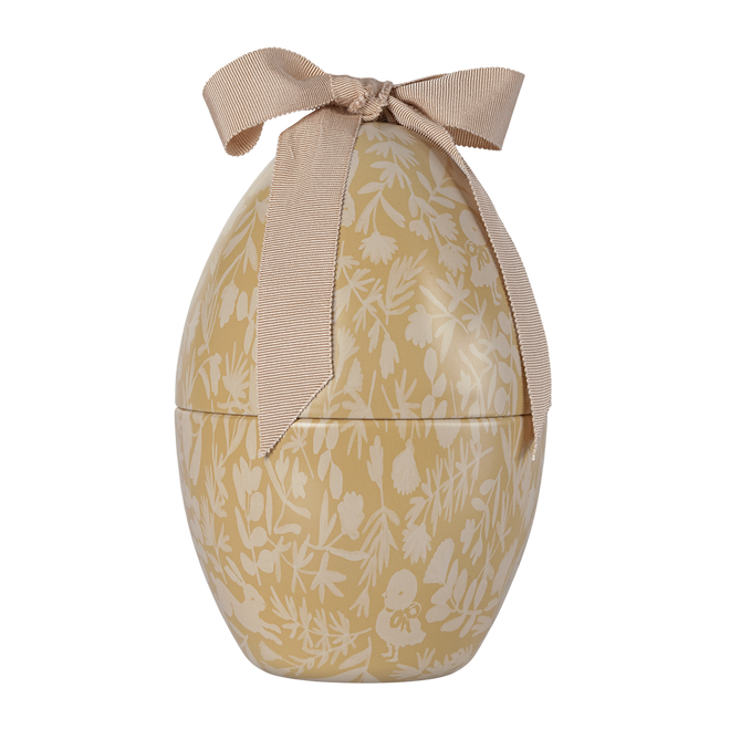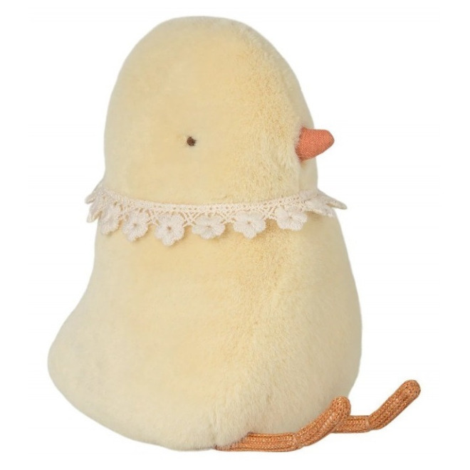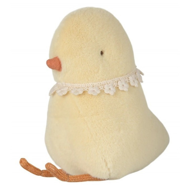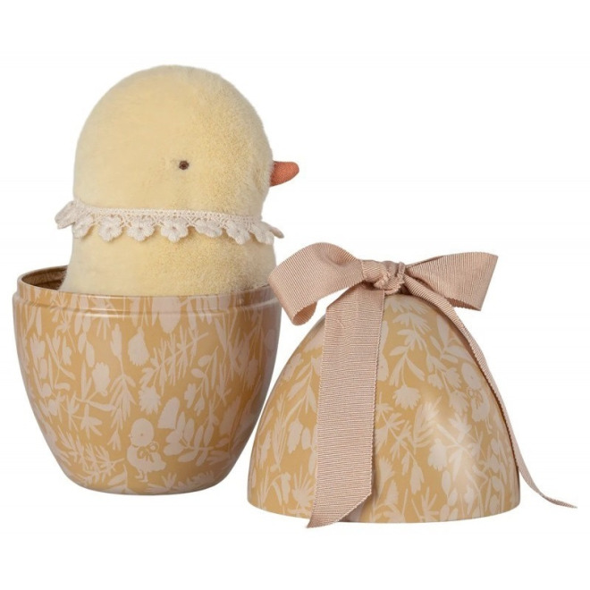 W środku jajka znajduje się pluszowy kurczaczek z kolekcji wielkanocnej Maileg.