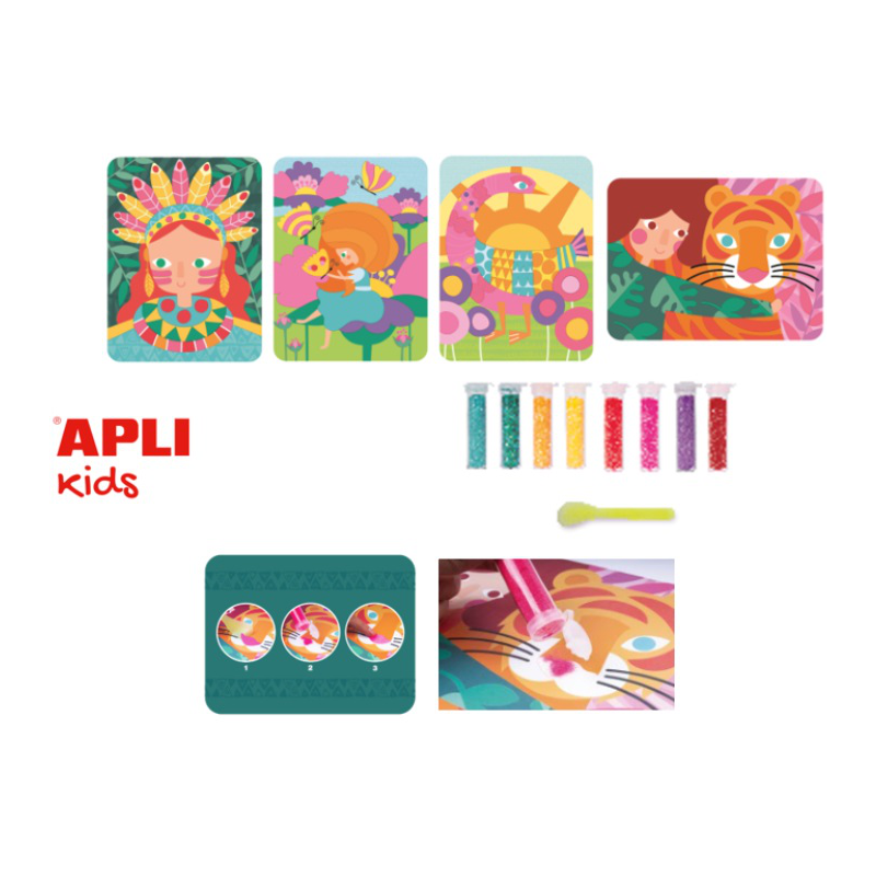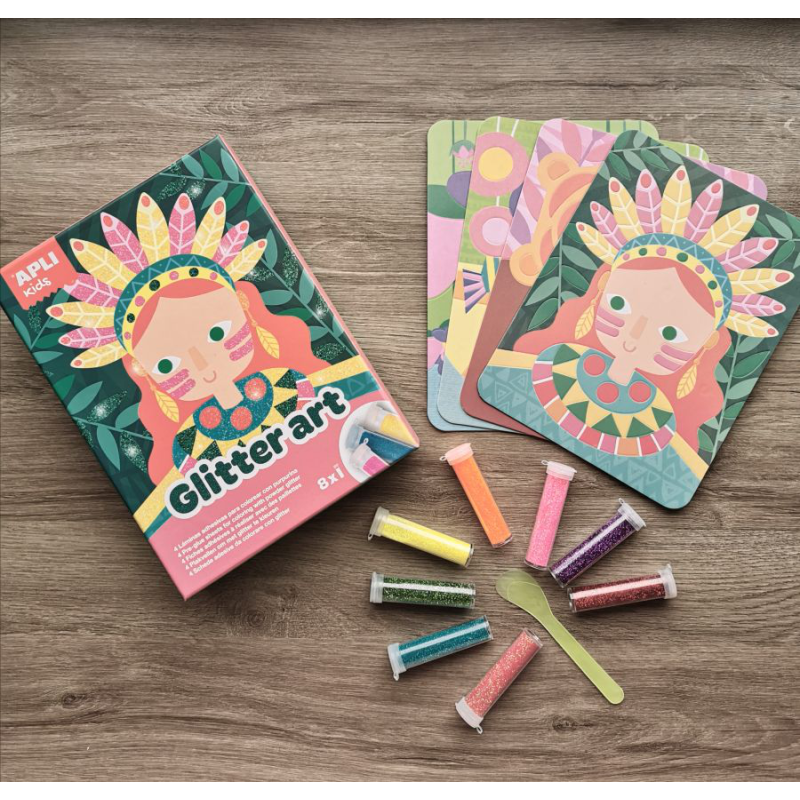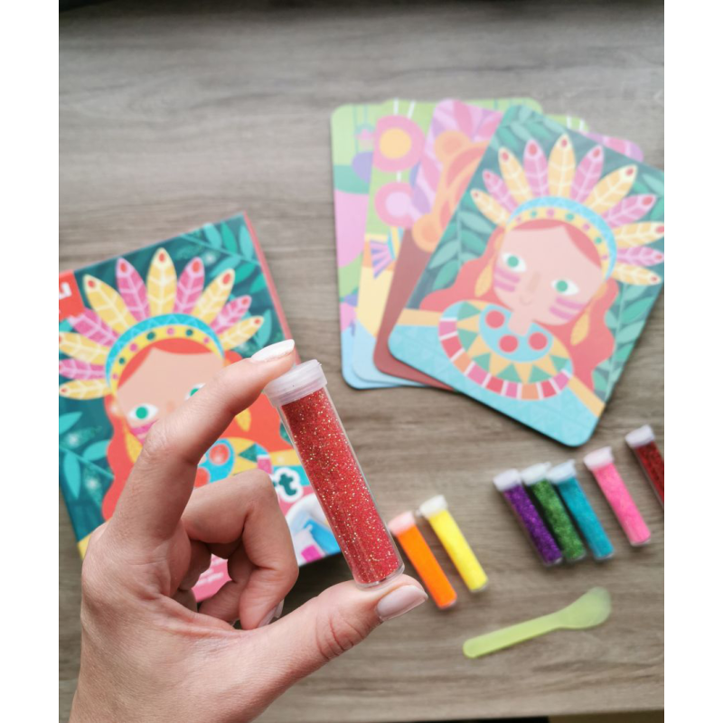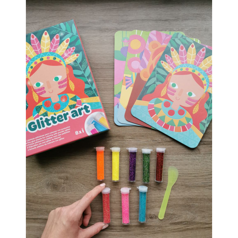 - 8 pojemniczków z brokatem, 4 karty do ozdabiania, łopatkę, instrukcję