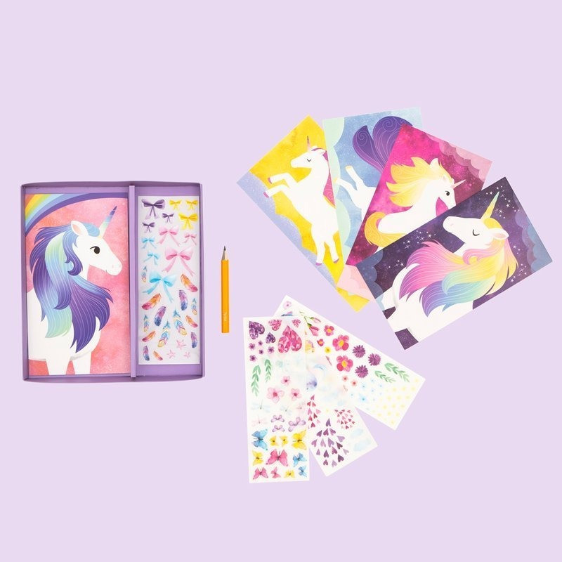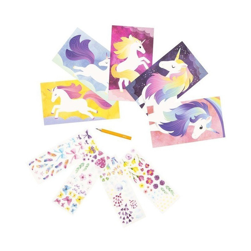 - 5 obrazków, ołówek i 4 arkusze z elementami do ozdobienia jednorożców
