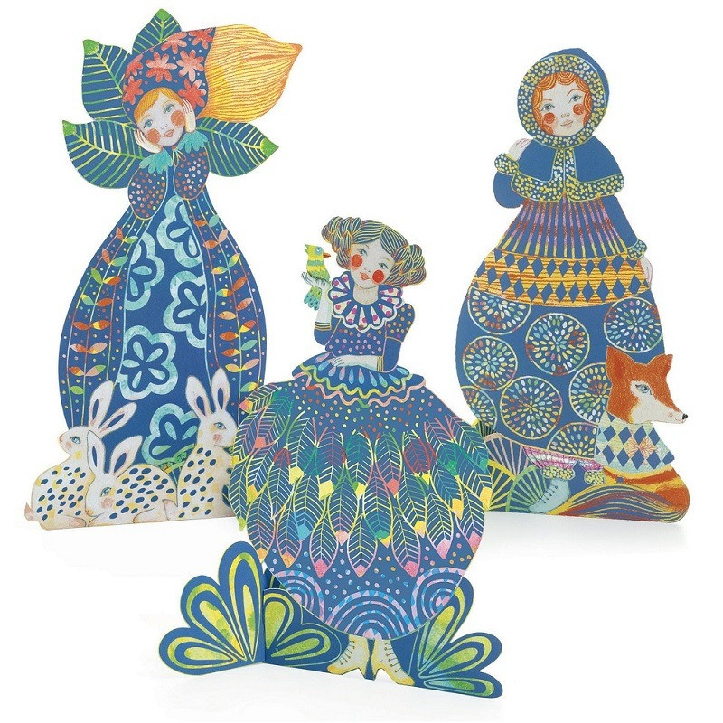 Złożone figurki dziewcząt ubranych w fantazyjne sukienki będą ozdabiały pokój, można je podarować bliskim.