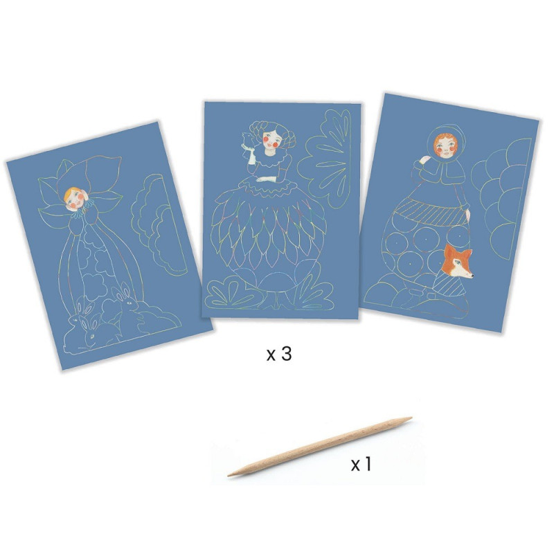 - 3 obrazki do zdrapania, 1 patyczek do zdrapywania, podpórki do postawienia figurek