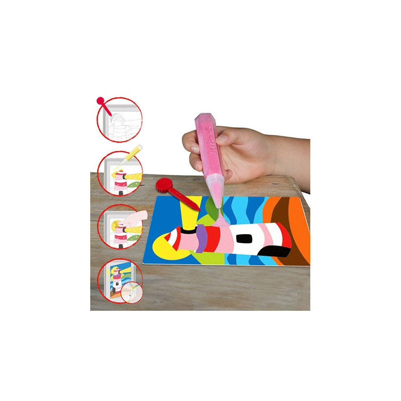 Praca z piaskiem podczas kolorowania rysunków jest nie tylko szczególnie przyjemna dla dzieci,