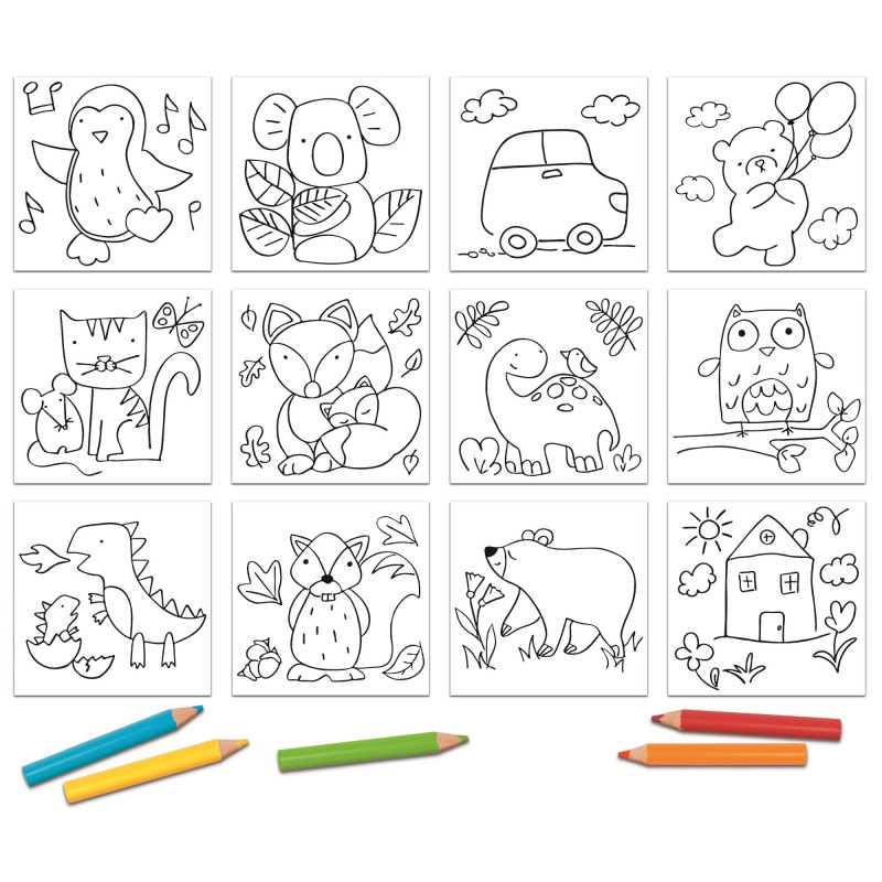 • 24 sympatyczne ilustracje do pokolorowania: 12 różnych wzorów, po 2 sztuki każdy. Kontury na obrazkach zadrukowane są specjalnym tuszem, wyznaczającym granicę, do której można kolorować, co ułatwia dziecku kontrolowanie gestu graficznego. Na początku zabawy dziecko może opisać, co przedstawiają obrazki. Interpretowanie rysunków sprzyja poszerzaniu słownictwa i stanowi doskonały wstęp do nauki czytania. Następnie maluch może przejść do kolorowania, eksperymentując swobodnie z grubymi kredkami ołówkowymi, zmieniając chwyt, ruchy ręki i nacisk na papier.