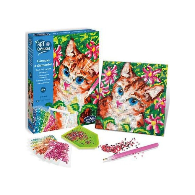 Zestaw artystyczny, pozwaląjacy ozdobić obrazek kotka cyrkoniami. Technika jest podobna do techniki Pixel Art - sztuka piksela. Za pomocą małego rysika dziecko ma za zadanie chwycić cyrkonie i przenieść je na samoprzylepną powierzchnię płótna.