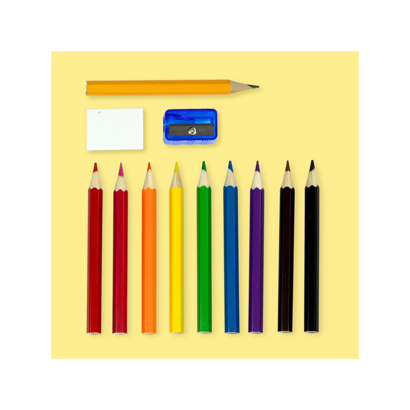 - 36-stronicowy szkicownik, książeczka „Jak rysować”, 9x kredek kolorowych, temperówka i gumka