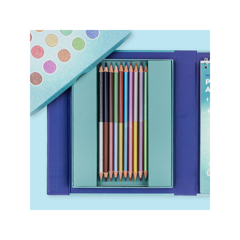 20 stron do kolorowania (papier premium), 10 dwustronnych metalicznych kredek (20 kolorów), magnetyczne pudełko do przechowywania