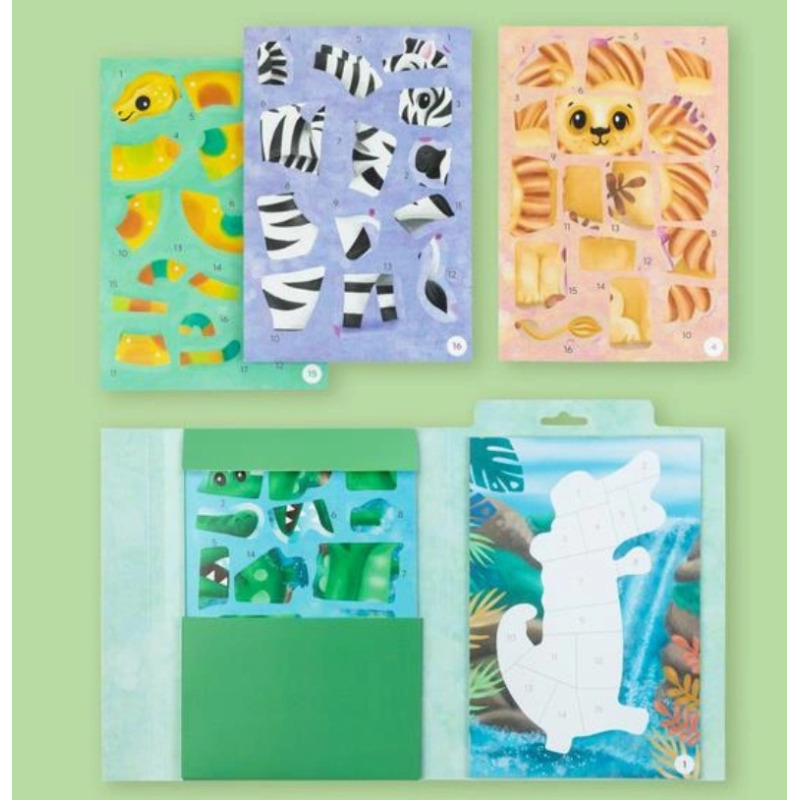 Skład zestawu: 16x ilustrowanych szablonów, 16 ponumerowanych arkuszy naklejek pasujących do szablonów, zabawne ilustracje o tematyce zwierzęcej