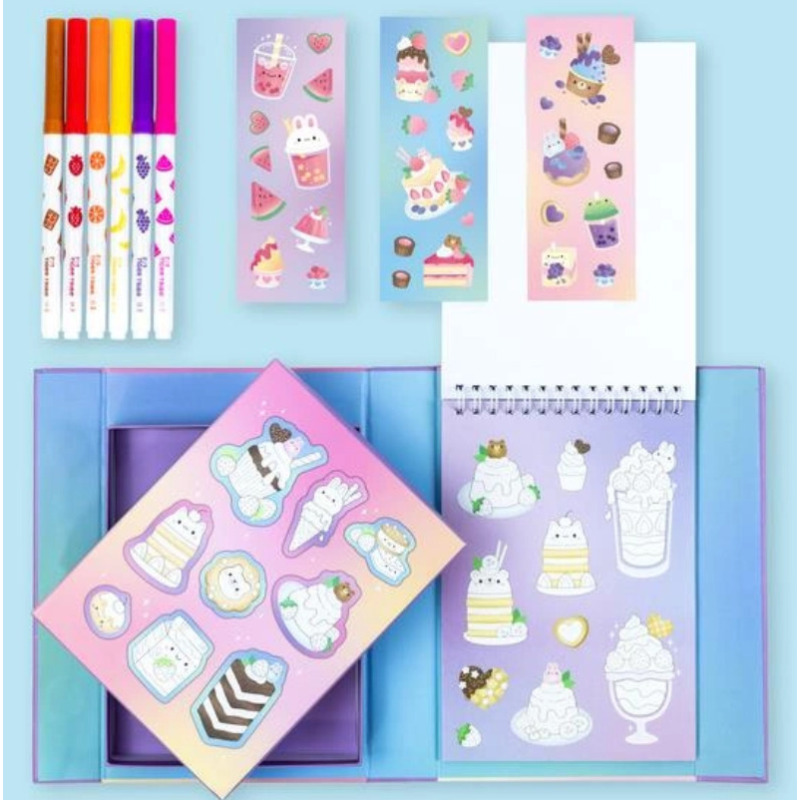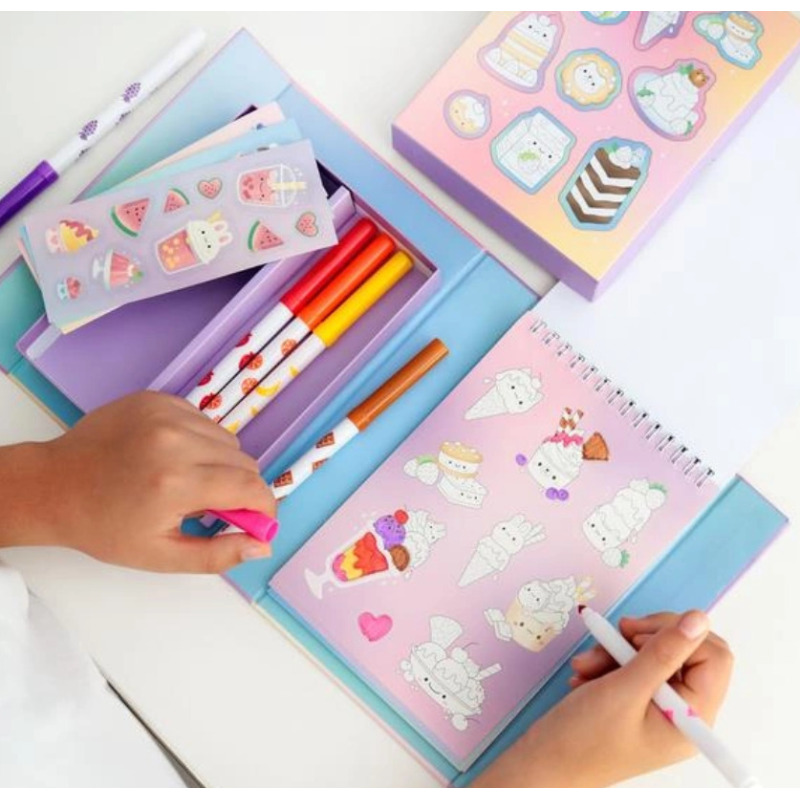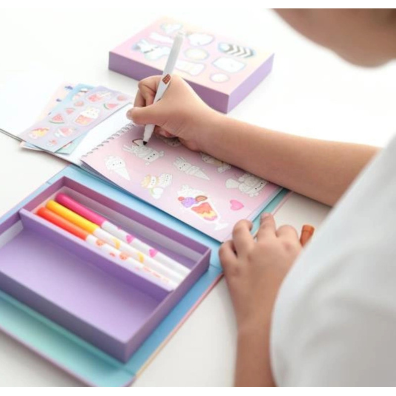Czas na naklejki! Świetny sposób dla dzieci na personalizację ich notatników lub pamiętników. Zestaw kreatywny wypełniony ponad 200 naklejkami do kolorowania; kolorowymi pachnącymi naklejkami i 16 arkuszami gotowych do pokolorowania naklejek, a do tego 6 słodko pachnących markerów do kolorowania.