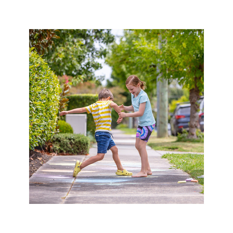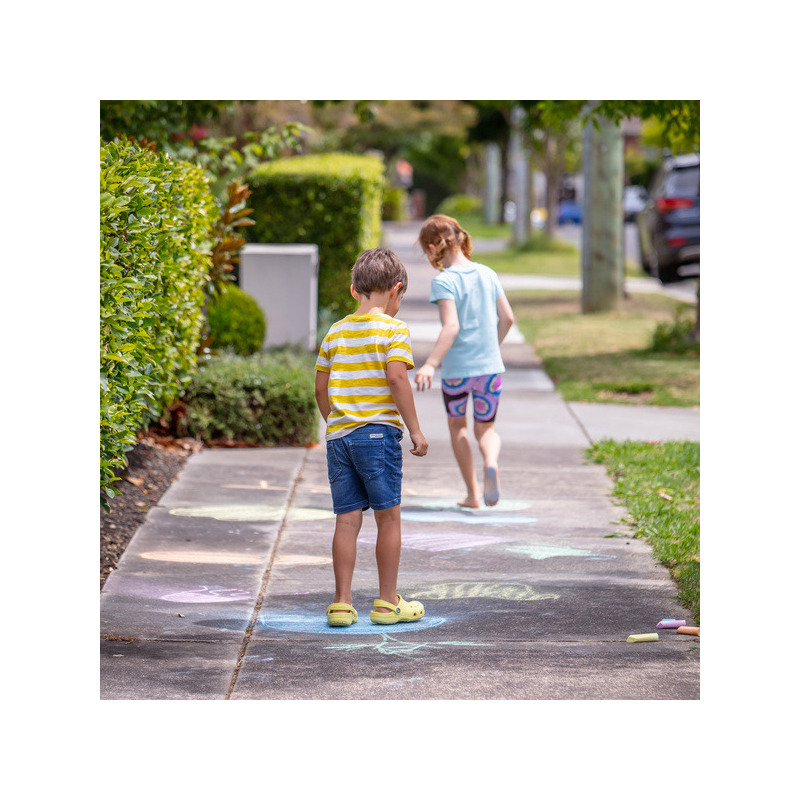 Dzięki temu zestawowi maluchy mogą cieszyć się kolorową zabawą na chodniku lub podjeździe, angażując się w aktywności, które rozweselą i jednocześnie uczą. Zawiera wszystko, czego dzieci potrzebują, by stworzyć ciekawe gry i zabawy, wykorzystując kredę do rysowania i malowania na zewnątrz.