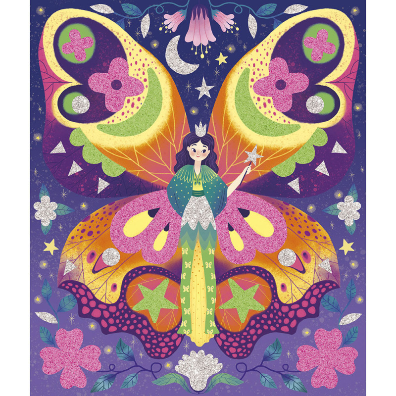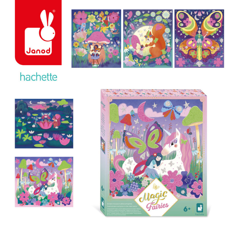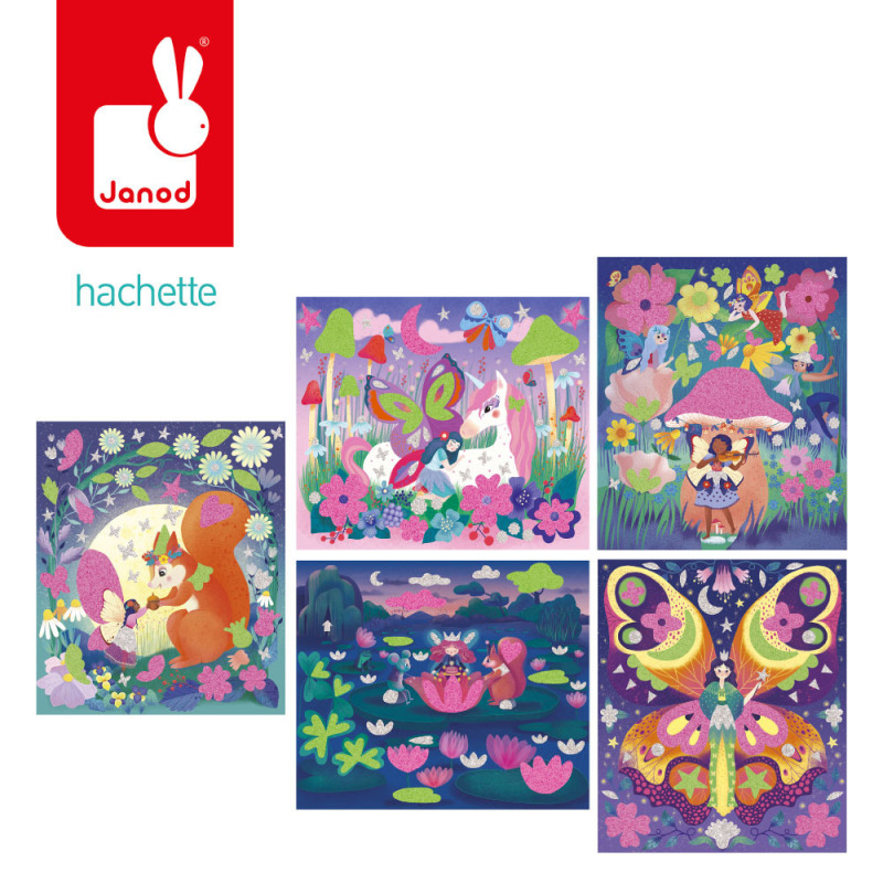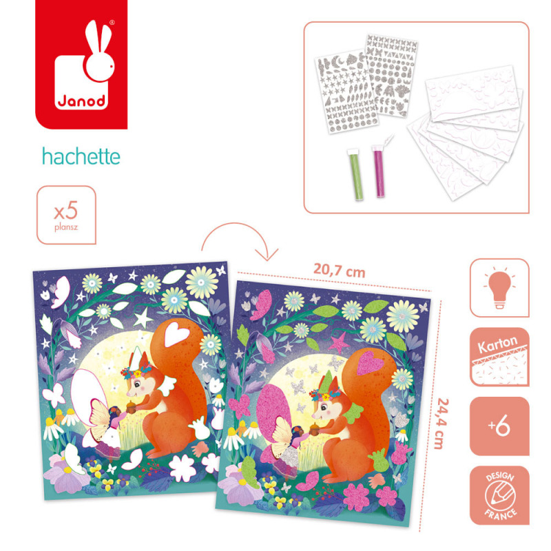 Zestaw kreatywny z piankowymi naklejkami i piaskiem Magiczny świat wróżek francuskiej marki JANOD. Zawiera 5 plansz-obrazków, przedstawiające życie wróżek w pełnym magii lesie. Ilustracje należy w odpowiednich miejscach ozdobić fluorescencyjnym piaskiem (zielonym lub różowym) oraz piankowymi i brokatowymi naklejkami (w zestawie).