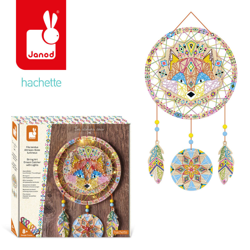 Zestaw kreatywny Łapacz snów Lis francuskiej marki JANOD zawiera wszystkie potrzebne elementy do stworzenia pięknej, podświetlanej ozdoby. Tworzenie tego dzieła, przeplatanie i komponowanie elementów to dla dziecka długie godziny angażującej i jednocześnie uspokajającej zabawy. Gotowy łapacz snów będzie powodem do dumy i wspaniałą dekoracją dziecięcego pokoju.