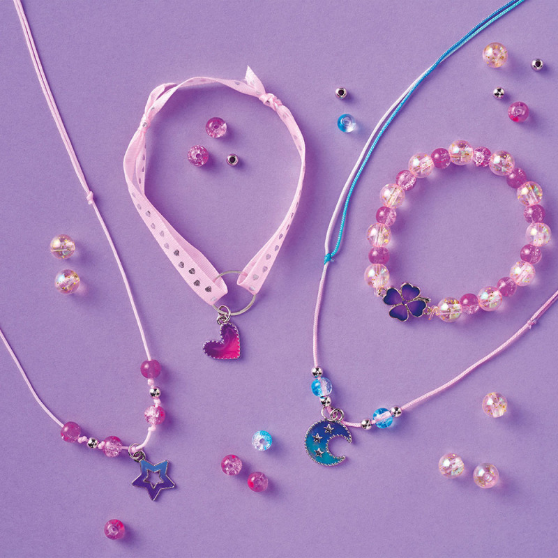 To wyjątkowy zestaw kreatywny do tworzenia biżuterii z zawieszkami zmieniającymi kolor! Pozwoli stworzyć w sumie aż 4 sztuki ozdób: 2 naszyjniki i 2 bransoletki. W jego skład wchodzą: koraliki w różnych kolorach (różowe, srebrne, niebieskie, brokatowe), 2 nitki (różowa i tęczowa), wstążka w serduszka oraz 4 wyjątkowe zawieszki – serce, gwiazda, księżyc i koniczyna – "magicznie" zmieniające kolor w kontakcie ze skórą (pod wpływem ciepła).