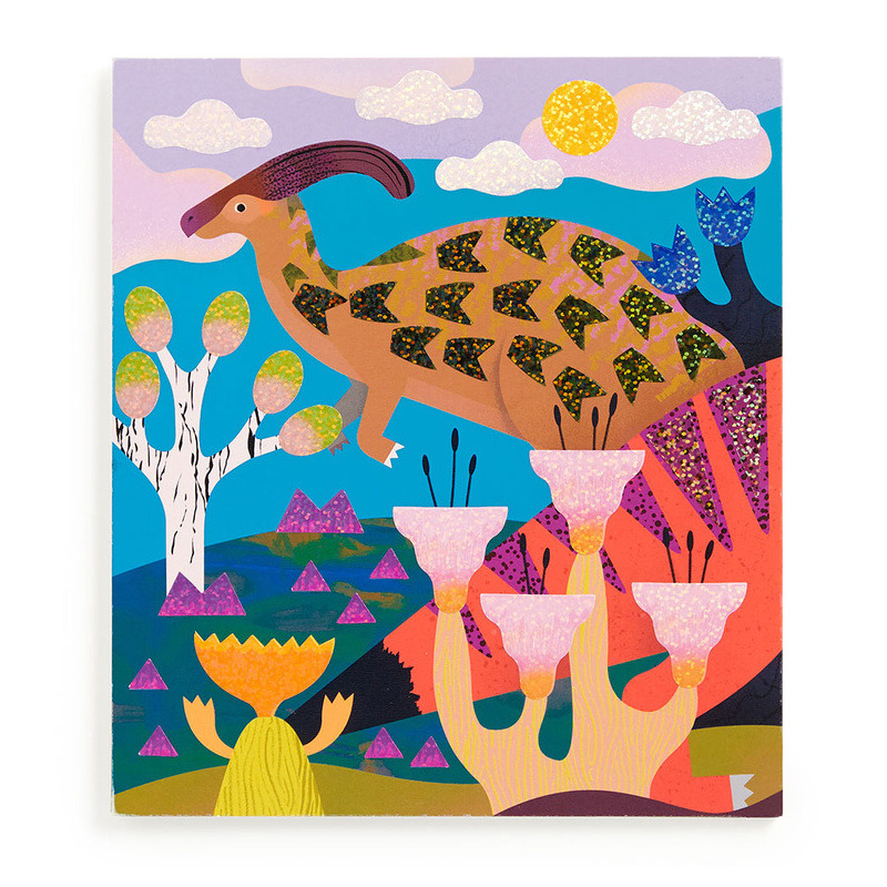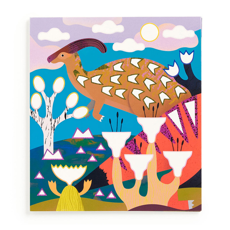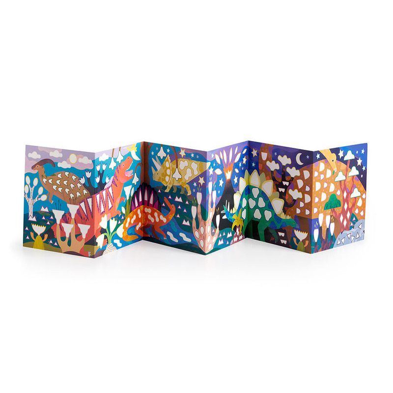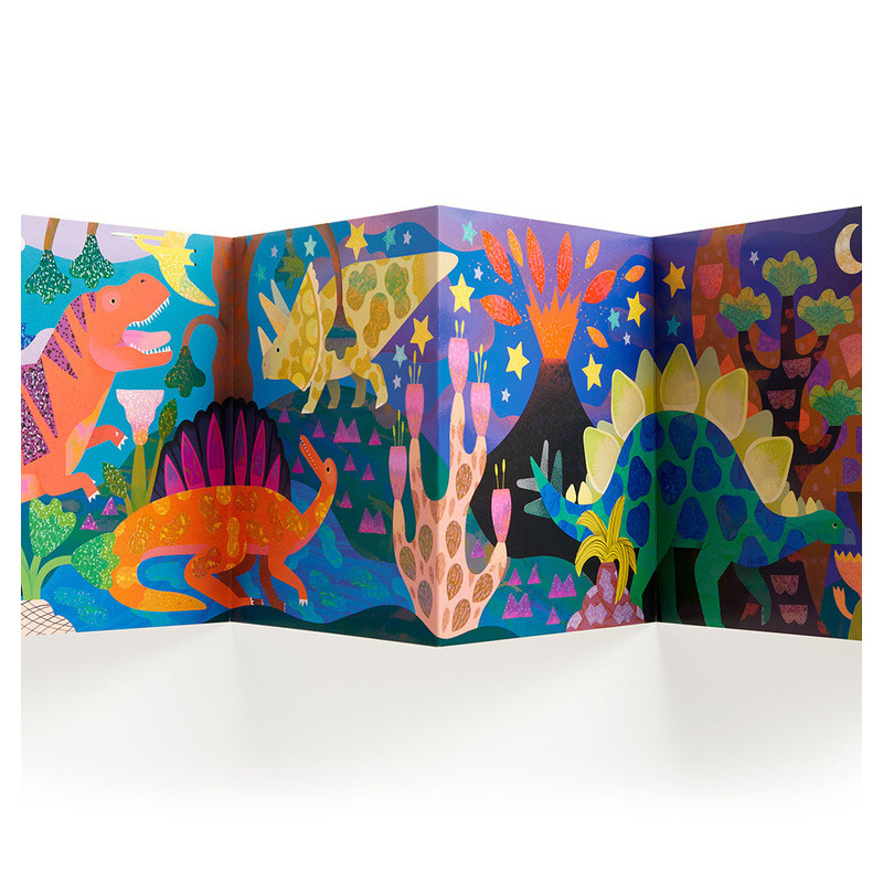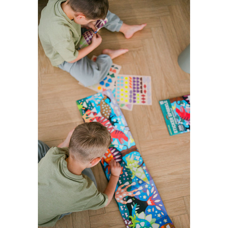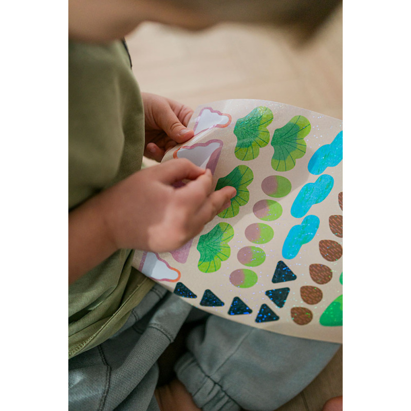 Zestaw kreatywny z naklejkami holograficznymi Kraina dinozaurów marki MUDPUPPY to doskonała zabawka rozwijająca wyobraźnię i zdolności manualne dzieci od 4. roku życia. W komplecie znajduje się rozkładana plakatowa ilustracja przedstawiająca prehistoryczny świat dinozaurów oraz 5 arkuszy z ponad 200 naklejkami o efektach holo (połysk i odbijanie światła) i brokatu. Dziecko może ozdobić plakat, przyklejając naklejki w wyznaczonych miejscach, tworząc kolorową, błyszczącą kompozycję.