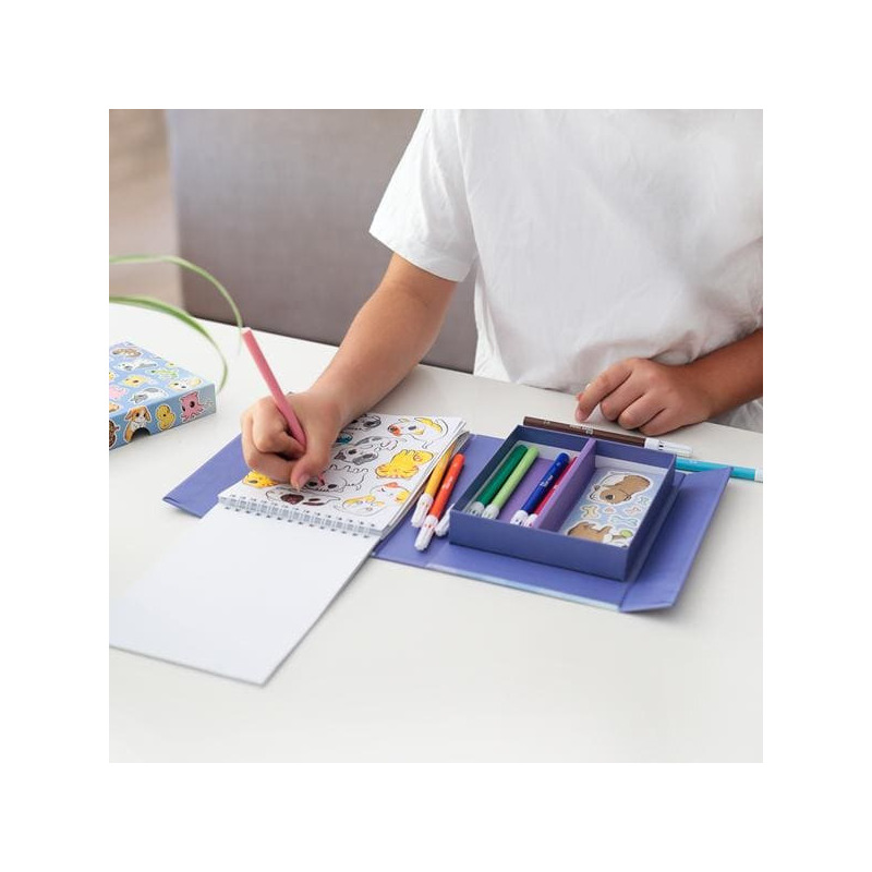 36 stron do kolorowania, 10 flamastrów, 5 arkuszy naklejek, magnetyczne pudełko do przechowywania.
