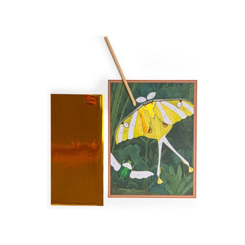 Zestaw z folią transferową DOOKOŁA ŚWIATA od Moulin Roty to kreatywna zabawa, która zachęca dzieci do tworzenia unikalnych dzieł sztuki. W zestawie znajdują się piękne ilustracje przedstawiające majestatyczne owady, które czekają na ozdobienie kolorową folią transferową. Dzięki starannie wyznaczonym miejscom do wykończenia, dzieci mogą łatwo przekształcić proste obrazki w pełne życia prace. Wystarczy wybrać motyw, a następnie odklejać pojedynczo białe pola, by umieścić folię na odpowiednich obszarach. Delikatne pocieranie załączonym drewnianym patyczkiem sprawia, że kolory przenoszą się na papier, tworząc efektowne detale. Krok po kroku, każda ilustracja nabiera kształtu i wyrazistości, co przynosi wiele radości z procesu tworzenia.