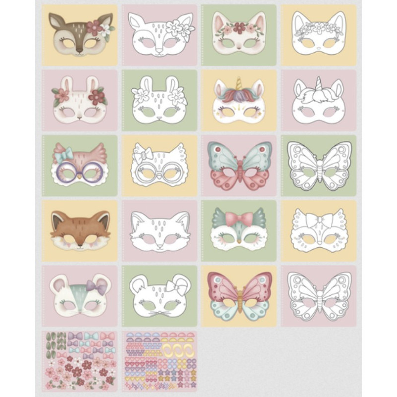 W środku znajdziesz 20 kolorowych masek do wycinania oraz bezpieczne nożyczki, idealne dla małych rączek.